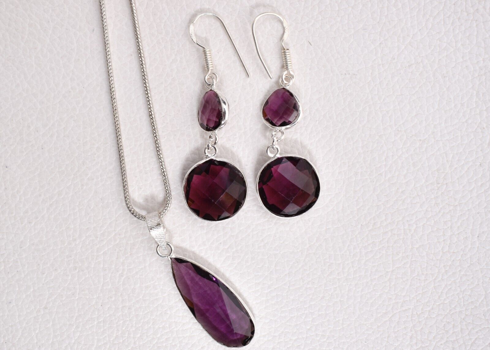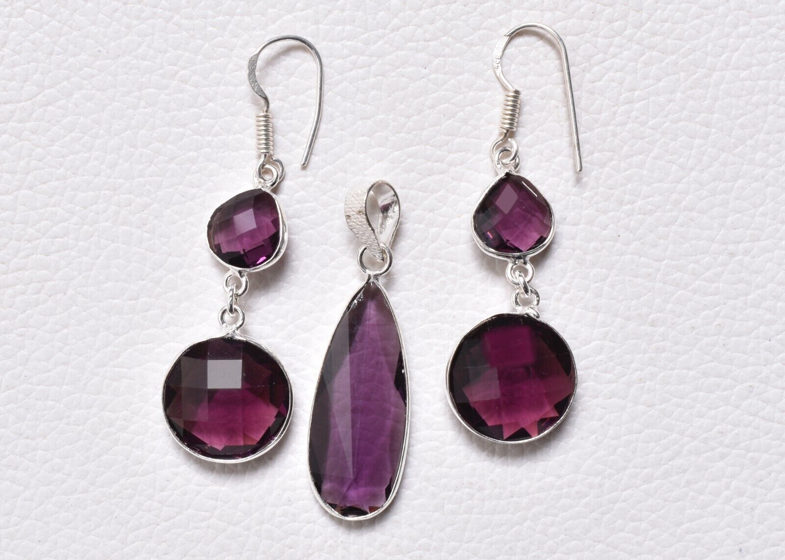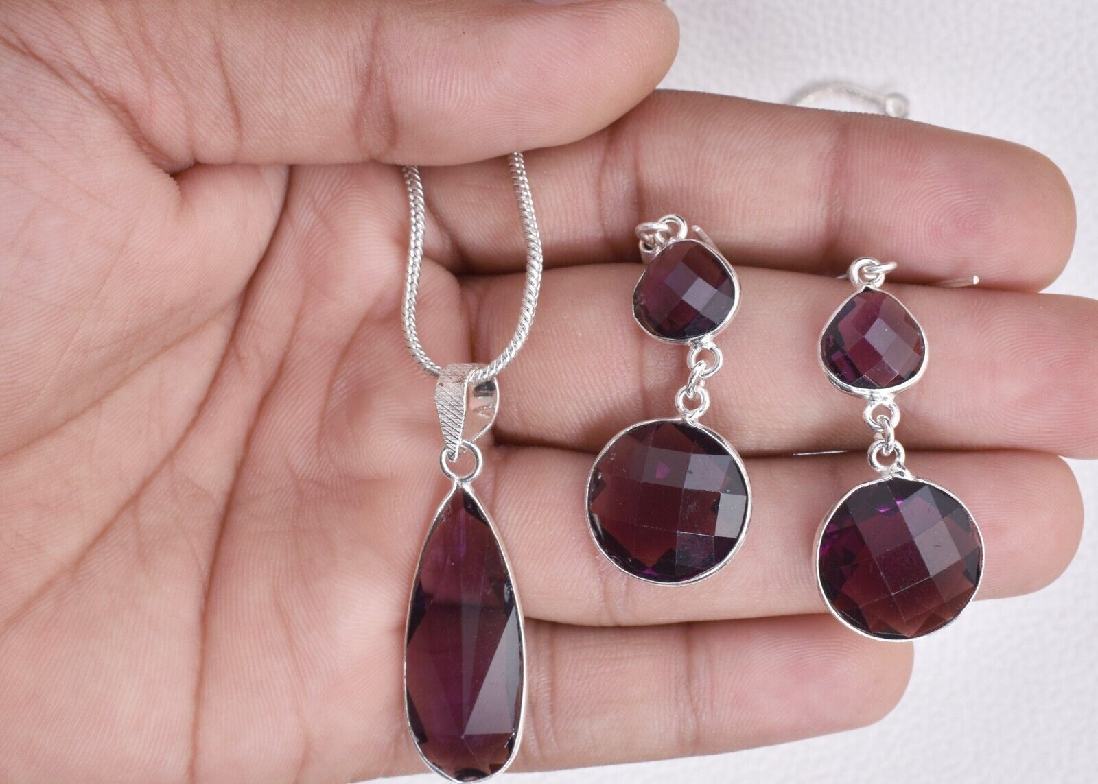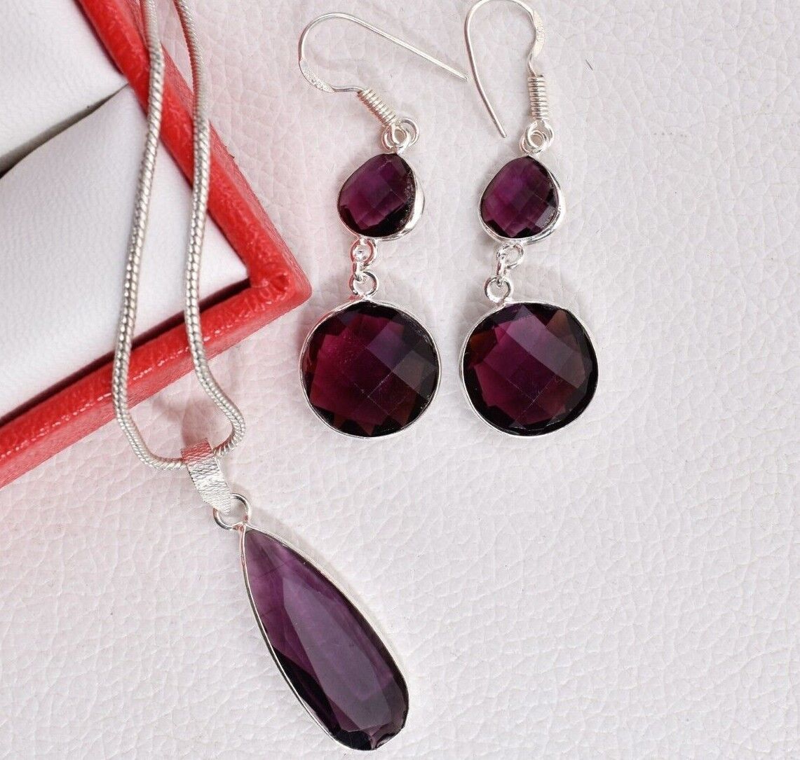 Argent Sterling Gemme Améthyste Fabriqué Main Pendentif Boucles Femme Fête Set