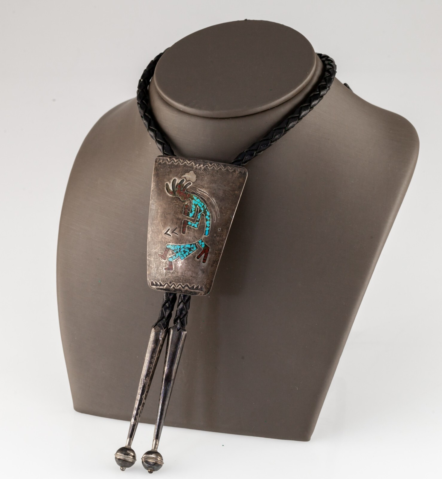 Splendido cravatta da bolo in argento sterling con motivo Kokopelli dettagliato