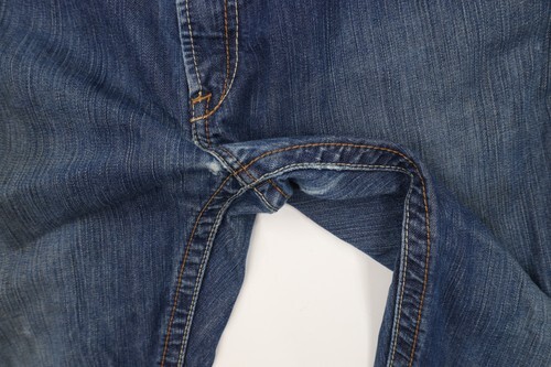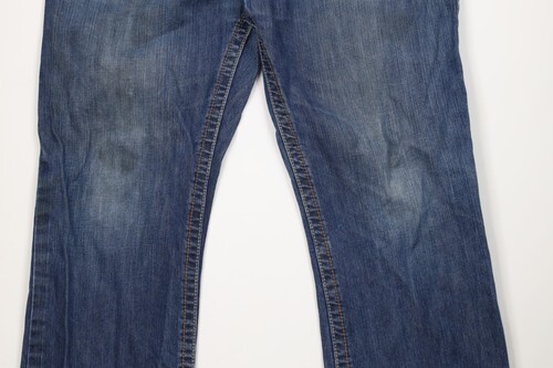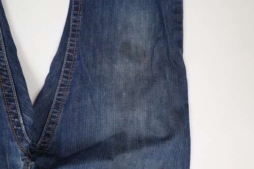Threadbare spot front crotch. Blemishes both legs front and back. Distressing cuffs and hand pockets. HAs color fade.