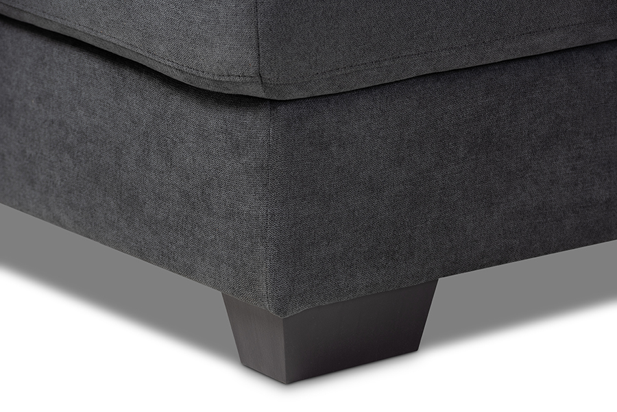 Features: Constructed from rubberwood, MDF wood, and LVL Walnut brown finish Upholstered in polyester fabric and padded with foam Removable back cushions Fixed seat cushions Black plastic feet Set Includes: One (1) Sectional Sofa