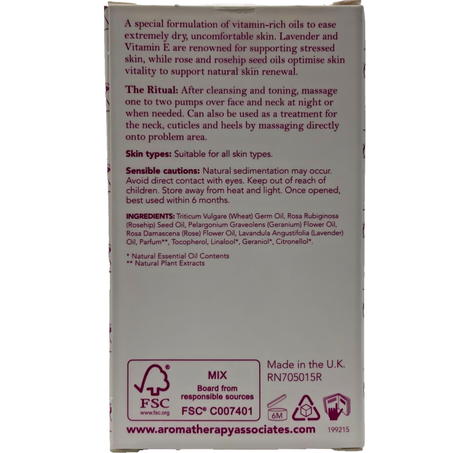 A special formulation of vitamin-rich oils to ease extremely dry, uncomfortable skin. Lavender and Vitamin E are renowned for supporting stressed skin, while rose and rosehip seed oils optimise skin vitality to support natural skin renewal.