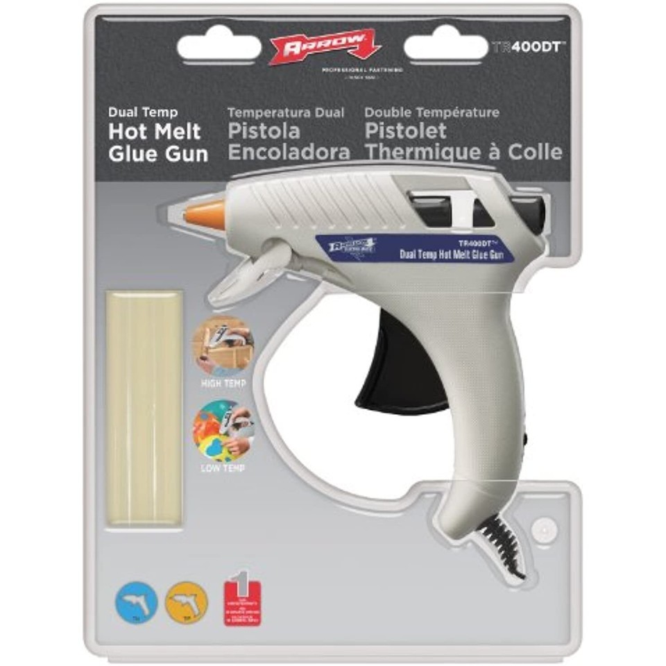 Product Description The Arrow Fastener TR400DT offers dual temp capability for maximum performance on any gluing task. High temp setting delivers maximum hold and faster setting time. Low temp setting is ideal for delicate materials and applications requiring a longer set time. Features durable housing, self-limiting heat chamber, dual temperature adjustment, and rubber safety nozzle. An integrated safety fuse protects both user and tool. Great for upholstery, crafts, and general repair projects. Designed for use with standard 1/2-inch glue sticks. From the Manufacturer The Arrow Fastener TR400DT offers dual temp capability for maximum performance on any gluing task. High temp setting delivers maximum hold and faster setting time. Low temp setting is ideal for delicate materials and applications requiring a longer set time. Features durable housing, self-limiting heat chamber, dual temperature adjustment, and rubber safety nozzle. An integrated safety fuse protects both user and tool. Great for upholstery, crafts, and general repair projects. Designed for use with standard 1/2-inch glue sticks.