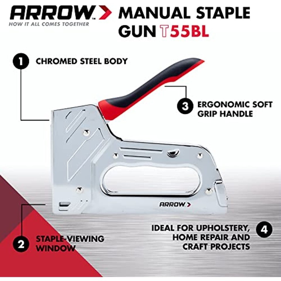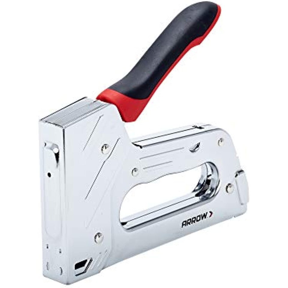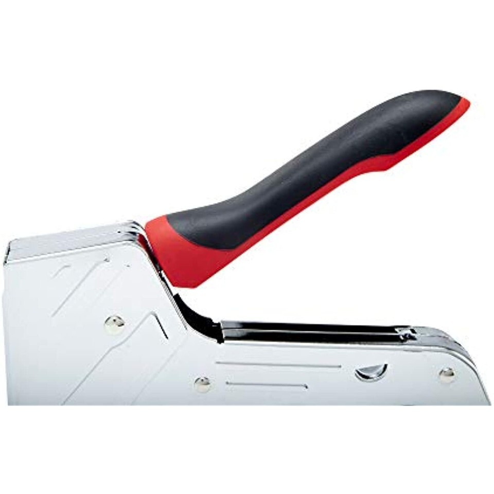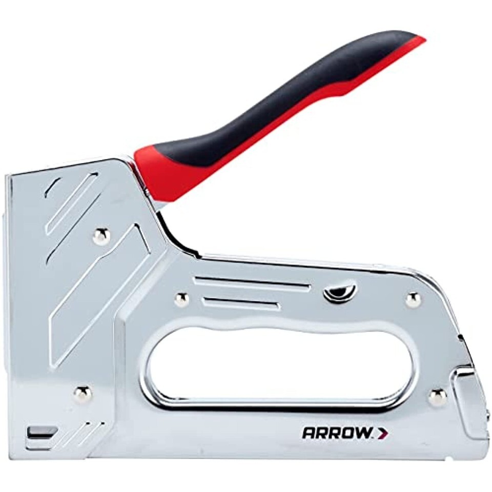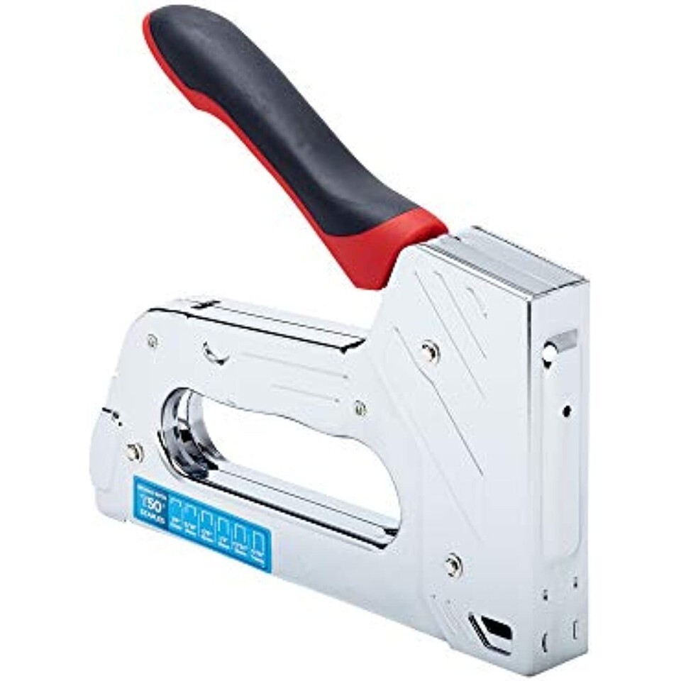 General purpose chrome plated Stapler, steel construction for durability, soft, rubber grip handle, bottom loading magazine saves time hassle, visual refill window shows the user if they have staples loaded, uses T50 staples: 1/4" TV #137-190, 5/16" TV #137-364 3/8" TV #137-406 17/32" TV #140-053 9/16" TV #353-562, great for upholstery, home repair, crafts, job site and/or office.