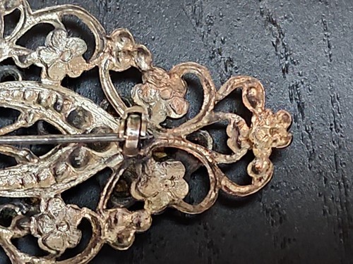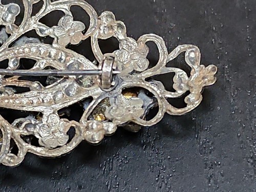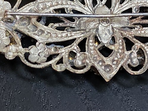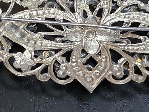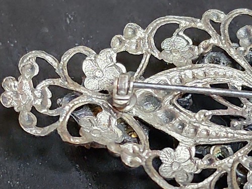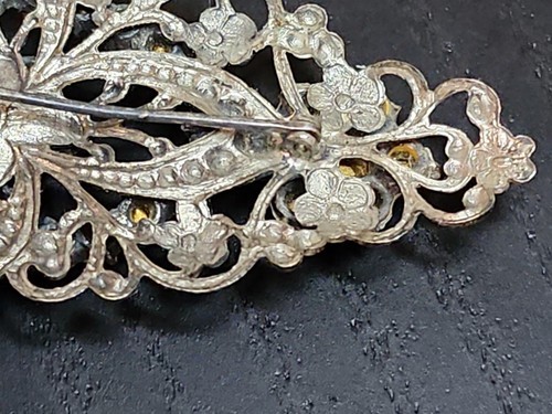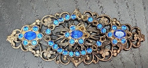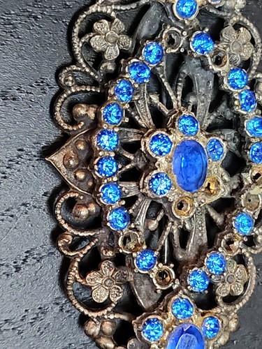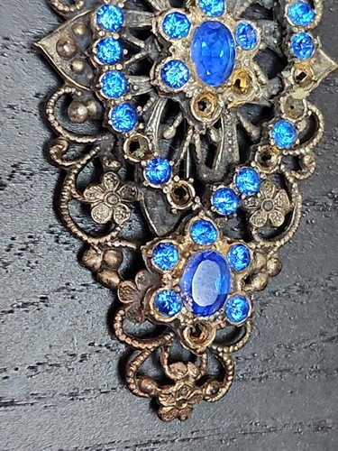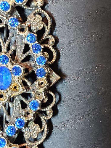 - Art Deco Czech Glass Brooch Pin Cobalt Blue Glass Open Work Silver Tone Filigree