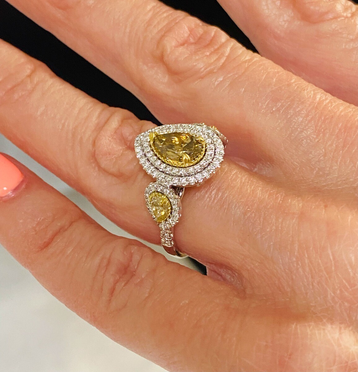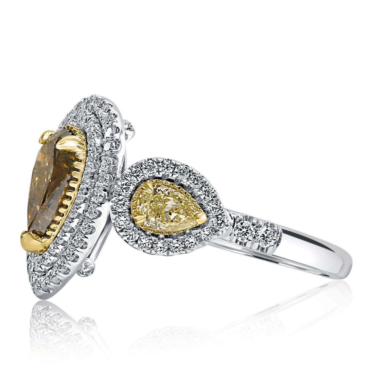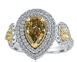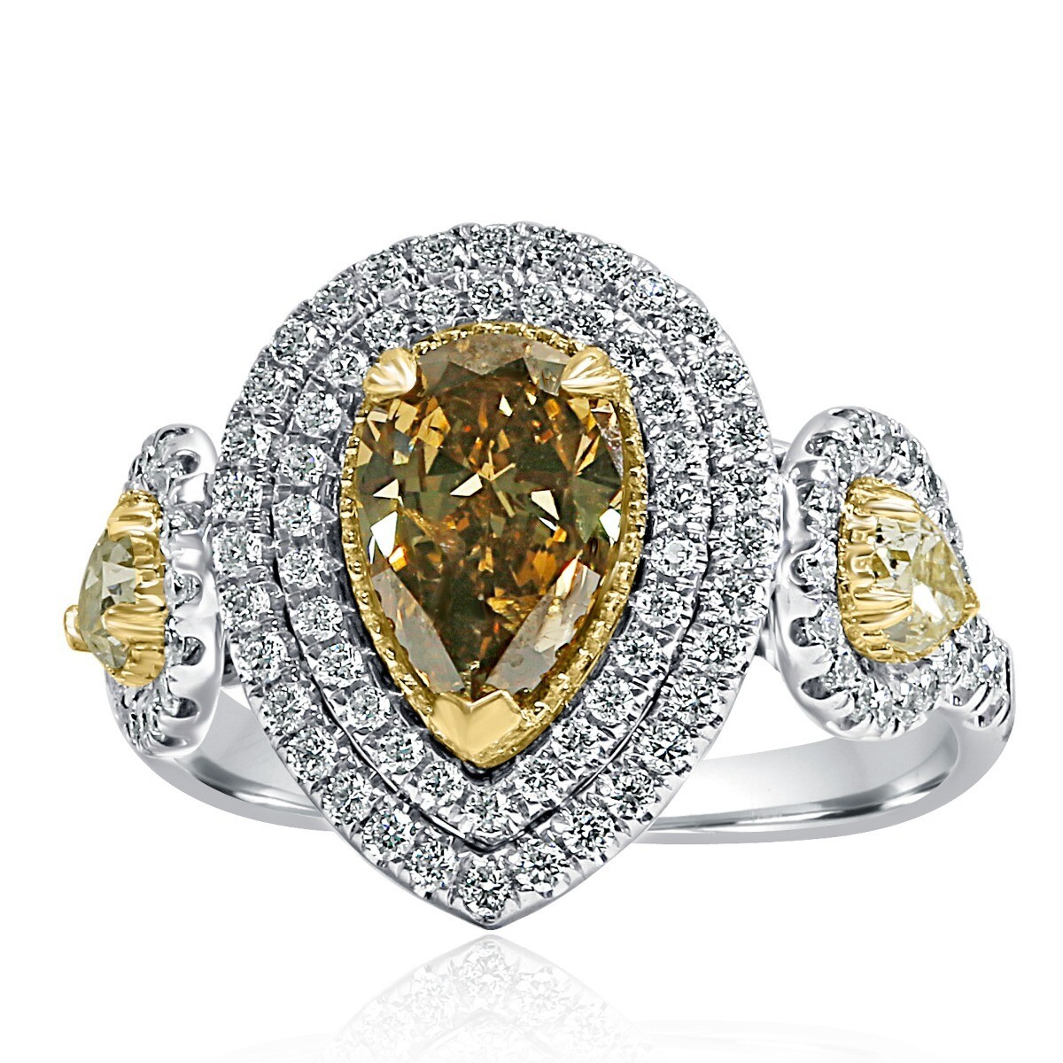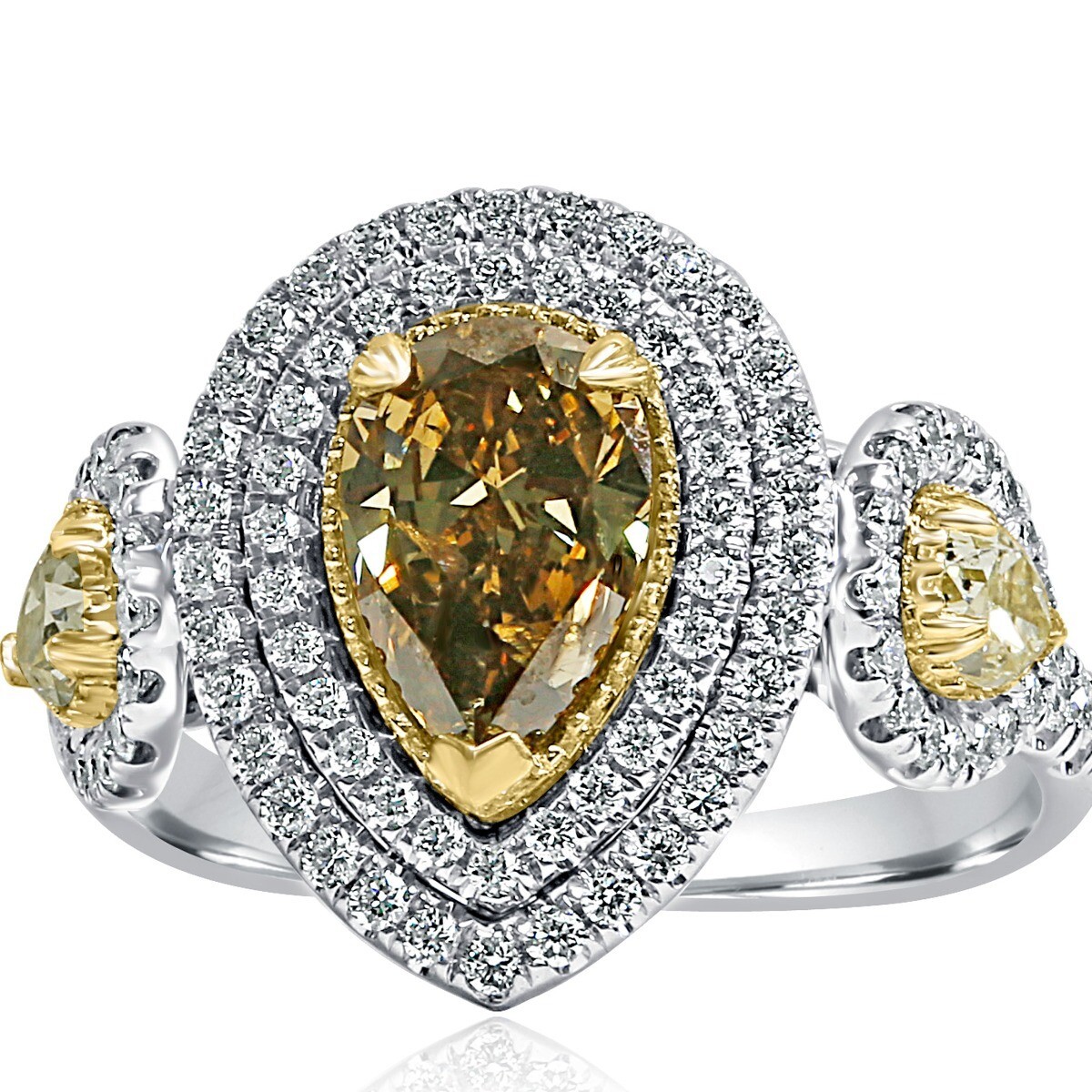 L O V E Forever... Gorgeous diamond engagement ring showcases a 1.10 carat pear-shaped yellowish brown natural diamond surrounded by a double halo of colorless sparkling round-cut diamonds. Two pear-shaped side faint yellow natural diamonds bring an air of glamour to this engagement ring. Handcrafted in 14-karat two-tone gold. The total carat weight is 2.32 carats.