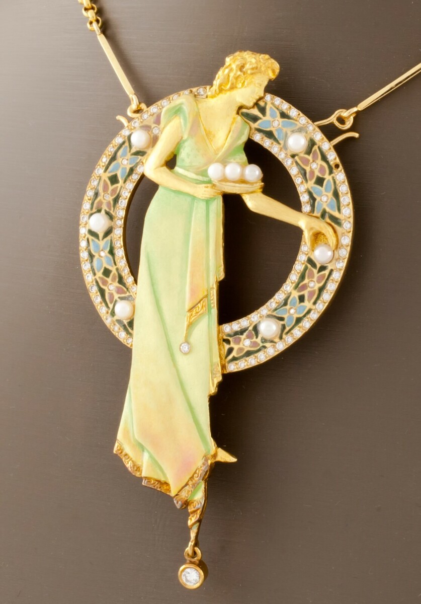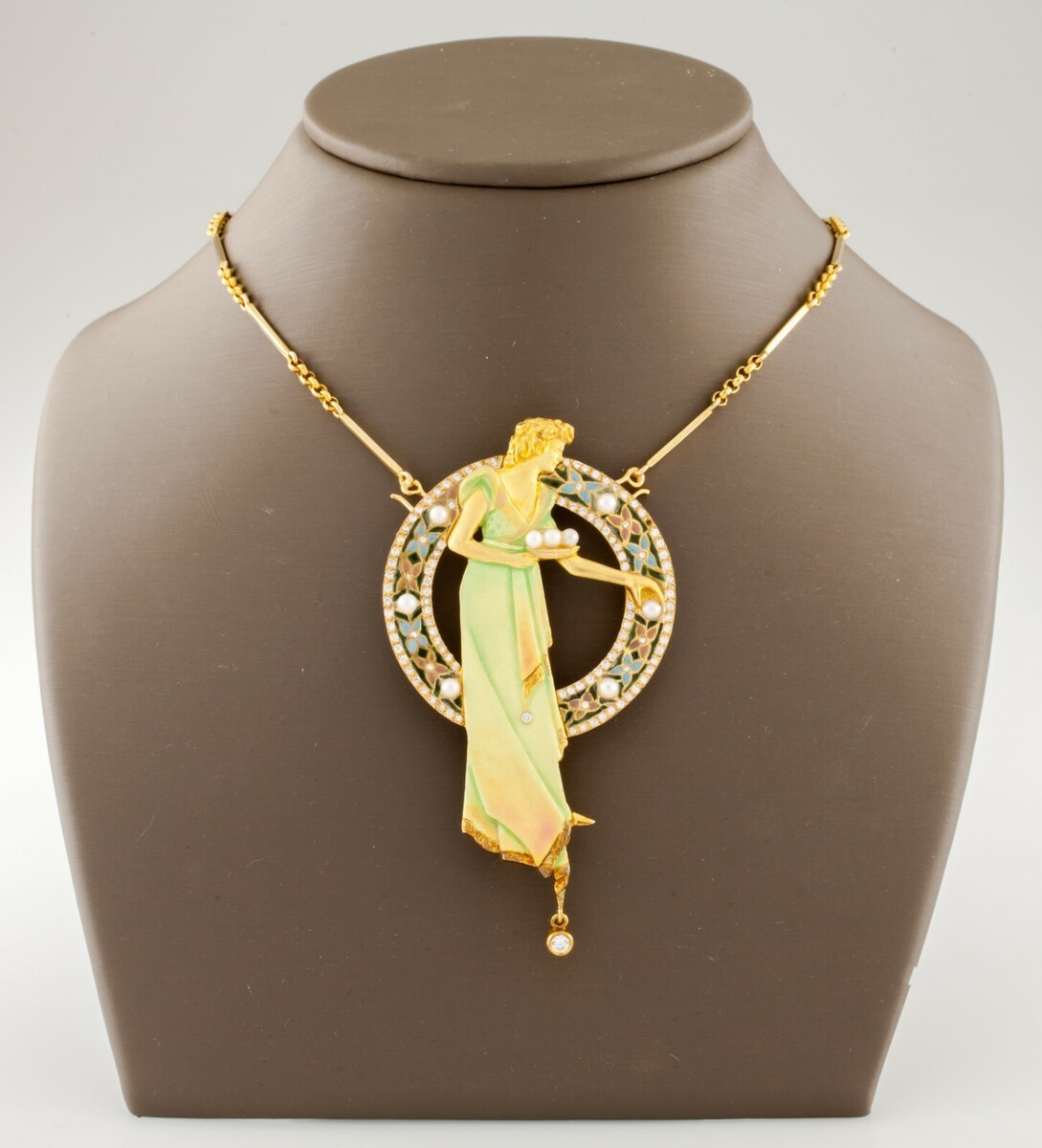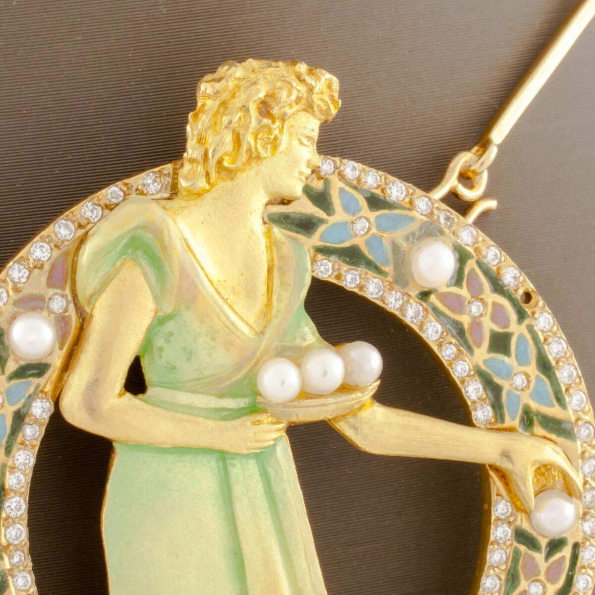 - Art Nouveau 18k Gold Plique-a-Jour Enamel, Pearl, and Diamond Brooch Pendant