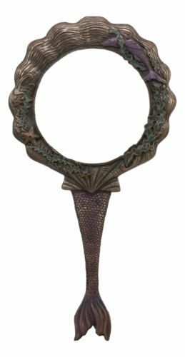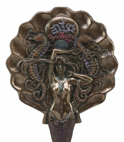 ? This beautiful Art Nouveau Mermaid mirror features a marine mythical mermaid surrounded by two sea horses and a giant oceanic shell at her backdrop. The Mermaid's tail serves as the mirror's handle. Its beautiful faux bronze finish along with hues of color on the body of the mirror produces a lively nautical art nouveau hand mirror.