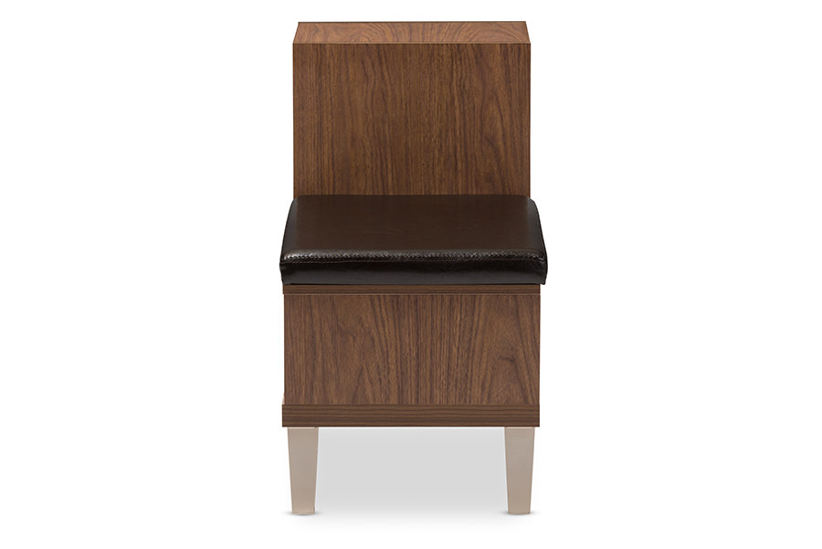 Simple and architectural, the Arthur 3-drawer shoe storage padded leatherette seating bench is reminiscent of modern and contemporary design. The Arthurs clean and functional design features powder coated vinyl legs supporting the framework of the seating bench while providing storage drawers for hallway essentials. Three generous sized storage drawers and two open shelves are built in providing storage solution to keep your entryway or hallway clutter free. Crisp, clean lines and finger grooves drawers give the shoe bench an effortless character and charm. The shoe storage bench, constructed of engineered wood and finished in walnut finishing will match with your modern interior decor. The Arthur bench, padded in foam and upholstered in faux leather, could be placed in your living room or entryway as shoe storage bench or seating bench. Made in Malaysia, the Arthur requires assembly.