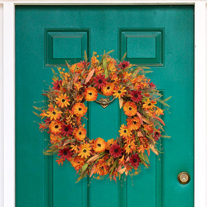 J'FLORU Orange Daisy Wreath is Full of Flowers in Different Autumn Colors