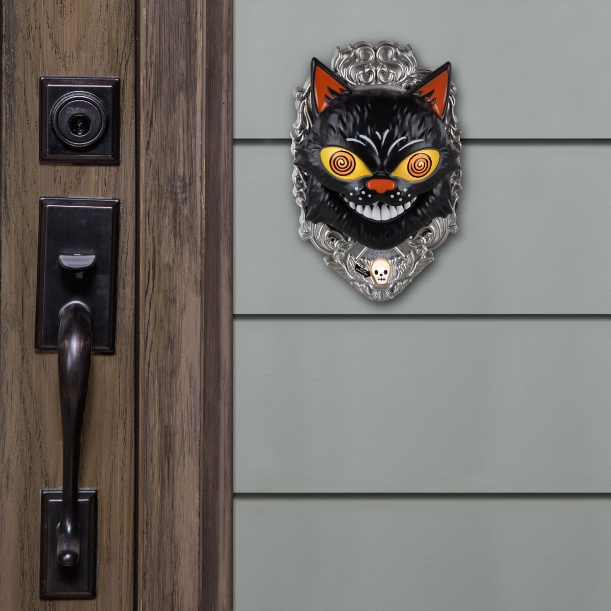 Hit the right mix of scary and playful in your Halloween dcor with this sound activated, animated black cat doorbell from Ashland. With flashing LED Lights, movements, and spooky phrases, this battery operated animated doorbell will spook trick-or-treaters or your party guests. It would make a wonderful addition to your entryway or covered patio paired with spiderwebs and creepy skeletons.