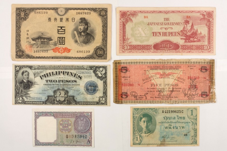 Asia notes. India, Japan, Philippines and Thailand. 19 notes. Mostly WWII but some before and a few after the war.