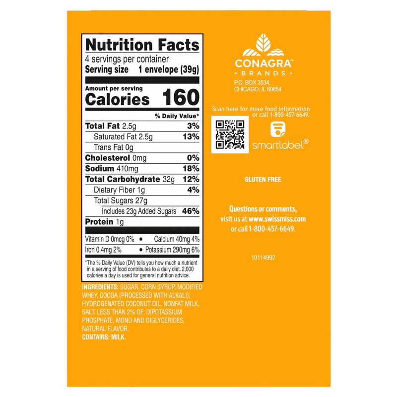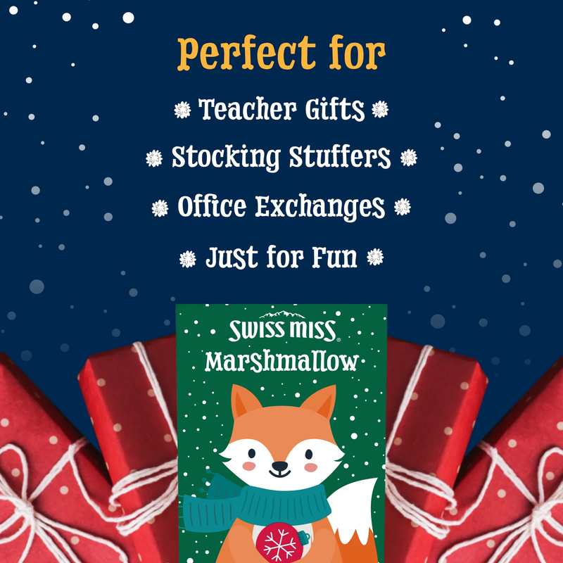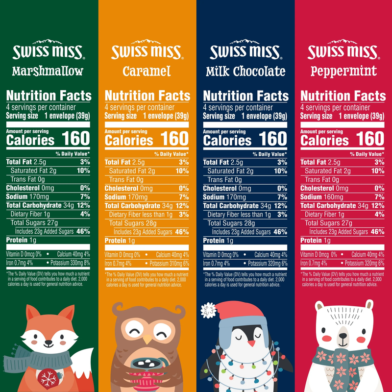 Contains four 5.52-ounce boxes with four envelopes of hot cocoa mix in each box; includes milk chocolate, marshmallow, peppermint, and salted caramel flavors Give the gift of Swiss Miss with this hot cocoa mix holiday box set Made with premium imported cocoa and real nonfat milk. Contains no artificial sweeteners, preservatives, flavors, or colors Celebrate the season with the delicious taste of Swiss Miss hot cocoa Stir up the perfect gift this holiday season