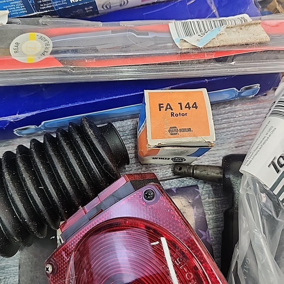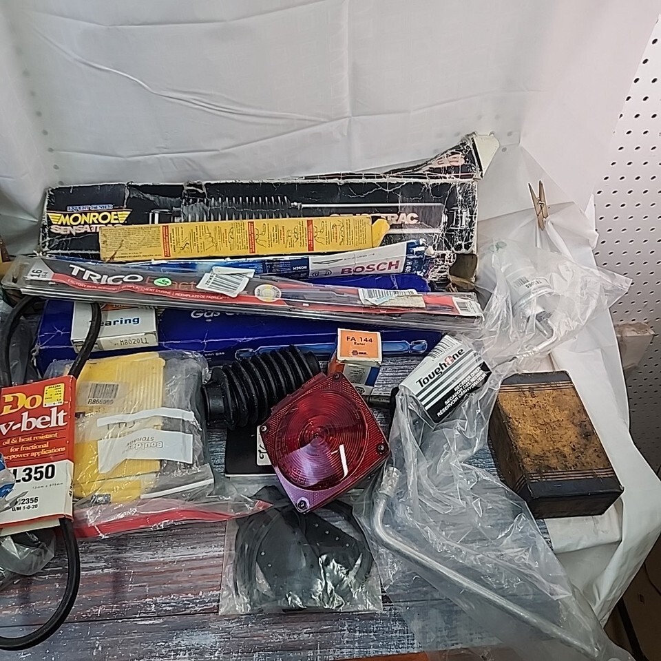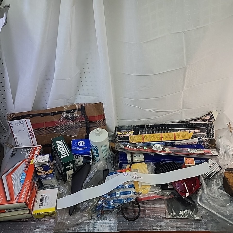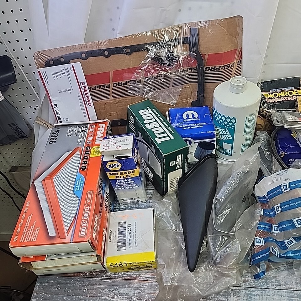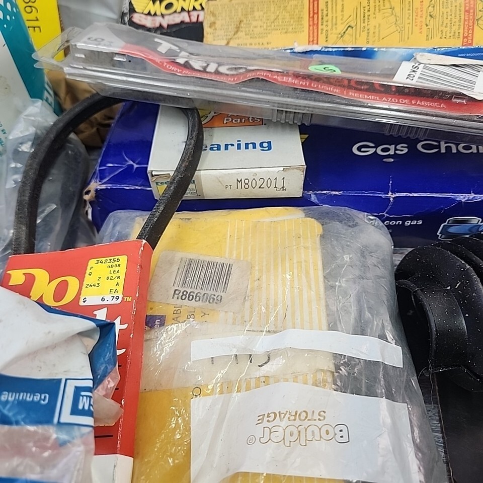 This assorted lot contains over 25 new old stock shocks, filters, gaskets, ignition parts, brake pads, and lights. The items include manufacturers such as NOS, KYB, AC Delco, and more. These parts are sold as units with no warranty, but they come with a California Prop 65 Warning for cancer and reproductive harm. This lot is perfect for car enthusiasts looking to purchase a variety of replacement parts at a discounted price.