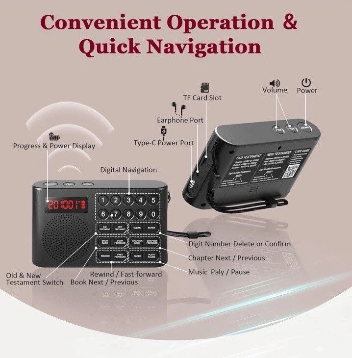 The KJV Audio Bible Player is a compact and portable electronic device that allows you to listen to the King James Version of the Bible on-the-go. With a sleek black design and a convenient size of 6.34 x 4.45 x 1.65 inches, this Bible player is perfect for those who prefer listening to the scriptures rather than reading them. It includes special features such as clear audio and quick chapter navigation, making it easier to follow along and understand the teachings of the Bible. Powered by 1 Nonstandard Battery batteries (included), this audio Bible player is a practical and accessible tool for anyone looking to deepen their spiritual connection through listening to the Word.