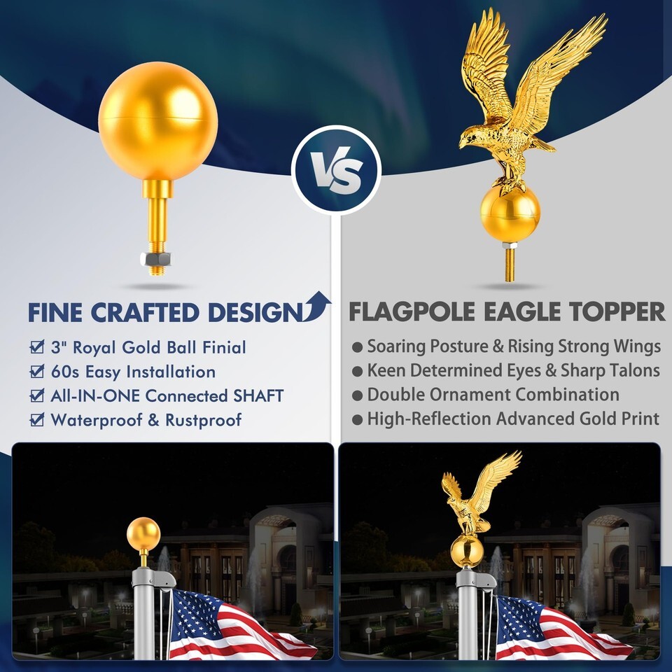 ELEGANT 3 INCH FLAGPOLE BALL TOPPER - This upgraded finial leaves your neighbors enthralled by its beauty golden glow in the sunlight. It is a perfect decor for the Stars and Stripes, conforming to the Official US Flag Code. FITTING MOST UNIVERSAL FLAGPOLES - The all-in-one shaft with 1/2"-13 Threaded Screw fits the most common size of the flag poles used in the USA. It features a straightforward design for quick and secure attachment to standard USA flag poles(1.7"-2.1" in Diameter, 20/25/30 Ft in Height, Telescopic/Sectional in Types). 30s EASY INSTALLATION - [1]Screw the bolt's short screw thread clockwise into the Ball's bottom. [2]Screw the Hexnut clockwise to the long screw thread end of the bolt. [3]Install the Screw on the Pulley Truck on the Flagpole. [4]You can also install solar flagpole lights before STEP 3. Illuminate your flag with endless glory 24 hours a day. 1Yr WARRANTY PURCHASE w/ Confidence - 1) Quality is Guaranteed. 2) Package INCLUDES 3" Gold Ball Finial,1/2"-13 Threaded Screw w/ Hexnut. 3) Pully Truck, Halyard Rope Clips Not Included. AUROLIT UNIQUE DESIGN SAFETY - An American brand hailing from Florida, Aurolit, which stands for Aurora Light, is dedicated to bringing the natural beauty of the Northern Lights to urban landscapes. Our fire-retardant lights ensure a SAFE YARD and a Green Relaxing LIFESTYLE.