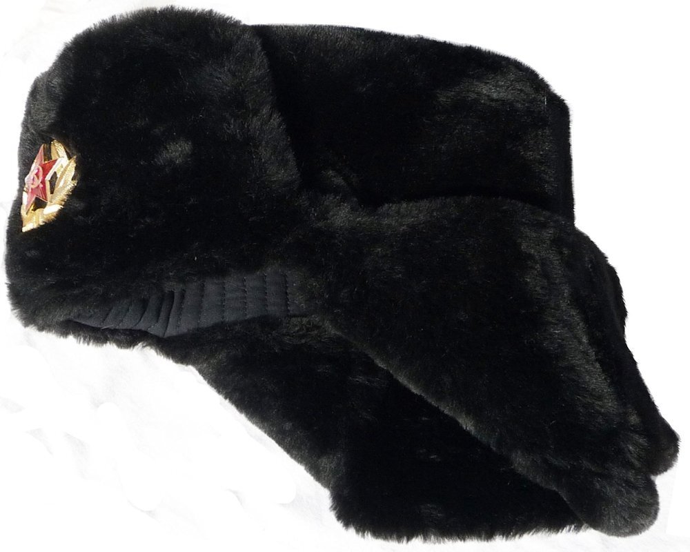 Questo cappello di pelliccia nera con lembi dell'orecchio e un tradizionale cappello invernale dell'esercito sovietico - caldo e accogliente, perfetto per proteggere dai venti siberiani e dalle tempeste di neve. E fatto di pelliccia finta. Questo tipo di pelliccia e stato progettato nell'Unione Sovietica appositamente per tali cappelli dell'esercito invernale. E noto per la sua durata e resistenza alla neve/acqua. Questo modello e disponibile nelle dimensioni S, M, L, XL, XXL. Ha un bel rivestimento trapuntato. Ogni cappello e fornito con un distintivo di soldato sovietico staccabile. Se fosse necessario, il badge si allontana facilmente senza lasciare segni sulla pelliccia. Possono essere indossati a orecchie verso l'alto o verso il basso. Il prezzo e per cappello. I materiali utilizzati