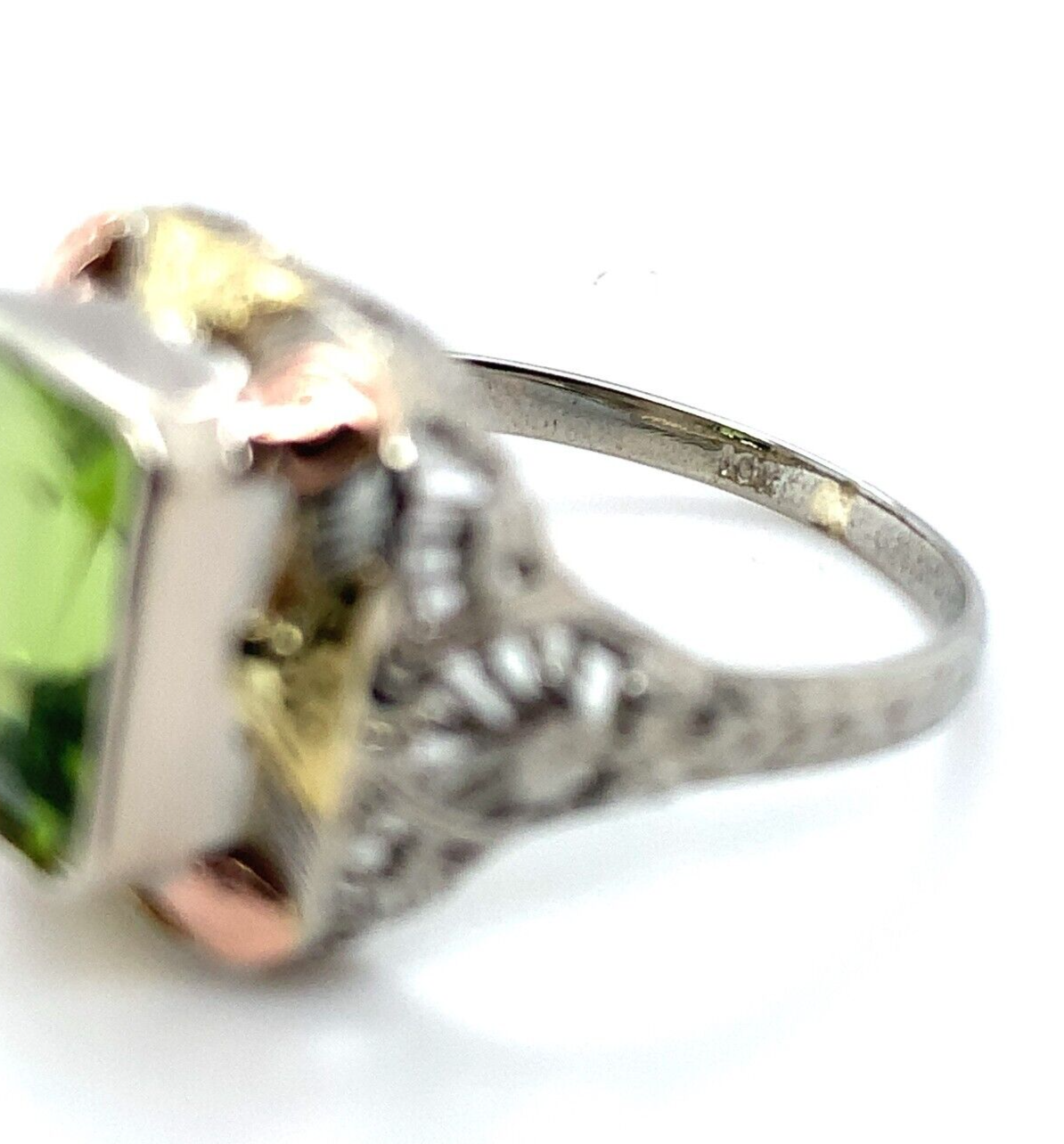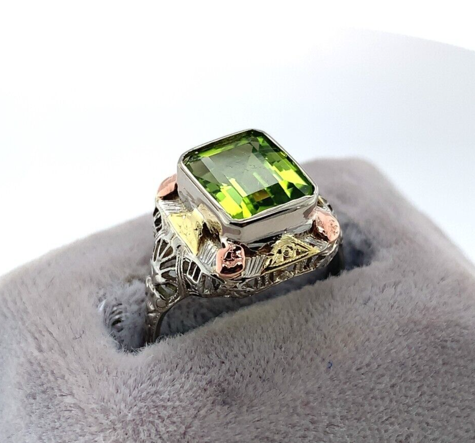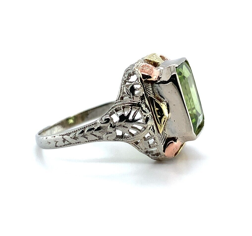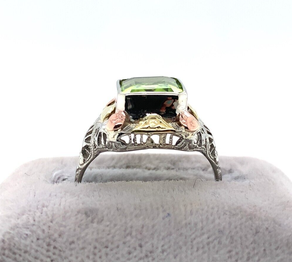 10k white gold filigree ring with applied rose gold and applied yellow gold accents. The ring features an emerald cut peridot weighing 2.55 carats and measuring about 9mm x 7mm. There is a new bezel. The ring fits a size 5 3/4 finger and weighs 1.89 dwt. It dates from the 1920s. Terrific!