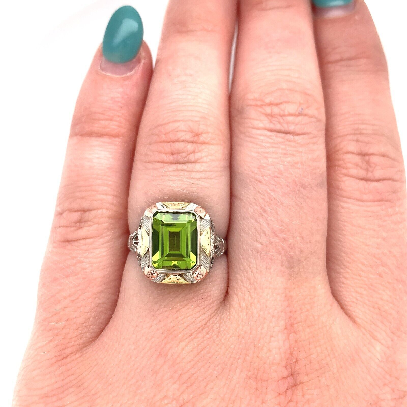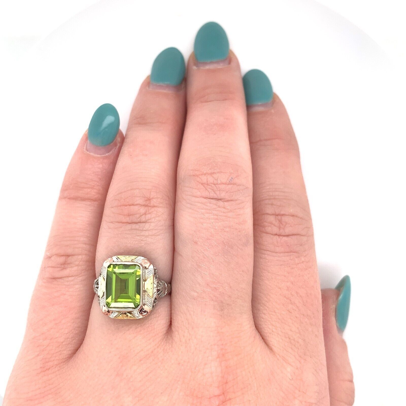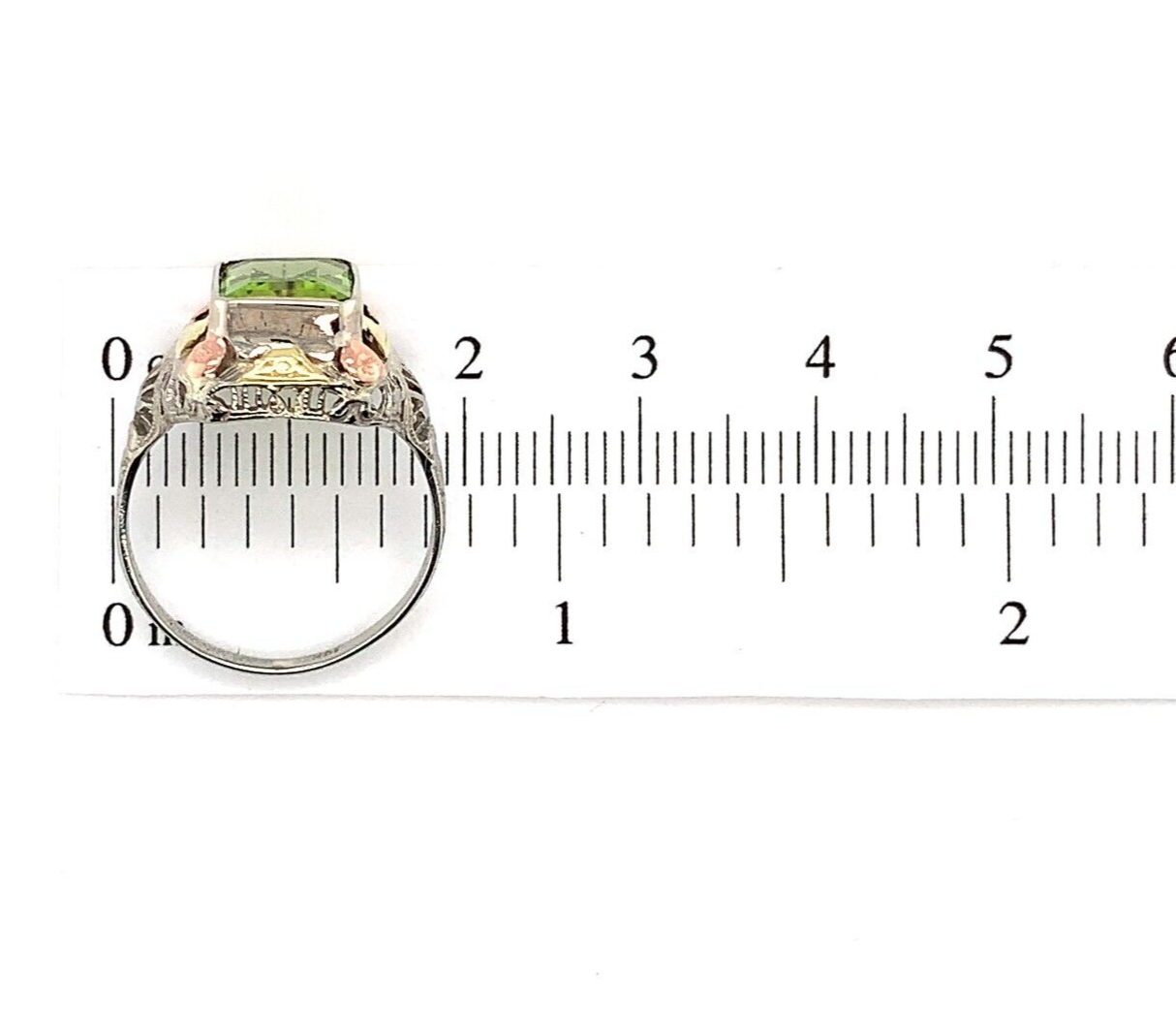 10k white gold filigree ring with applied rose gold and applied yellow gold accents. The ring features an emerald cut peridot weighing 2.55 carats and measuring about 9mm x 7mm. There is a new bezel. The ring fits a size 5 3/4 finger and weighs 1.89 dwt. It dates from the 1920s. Terrific!