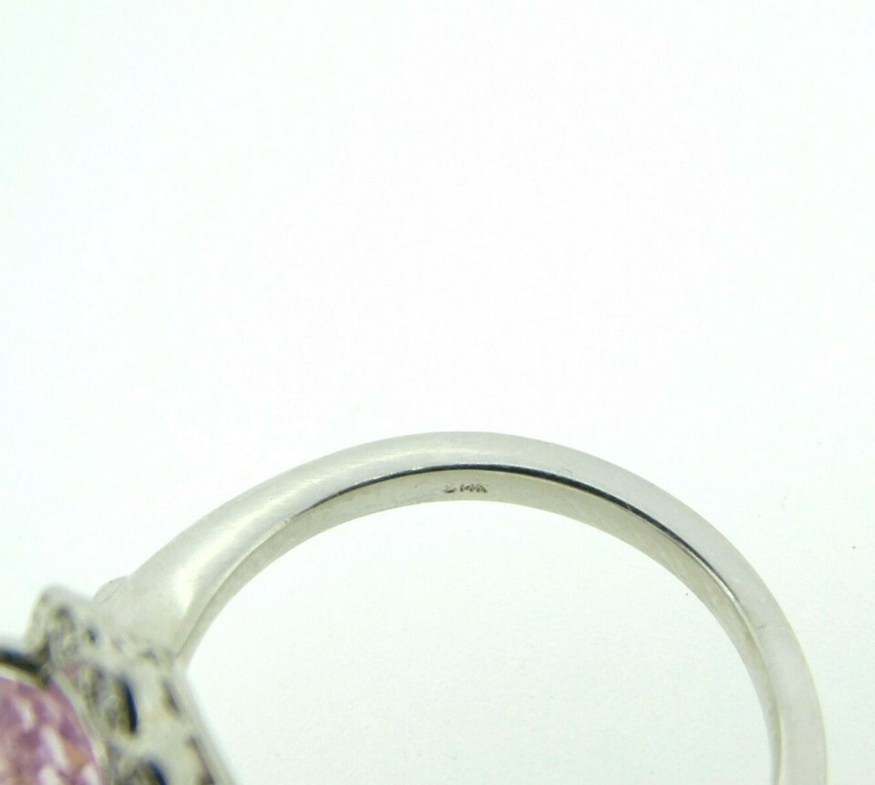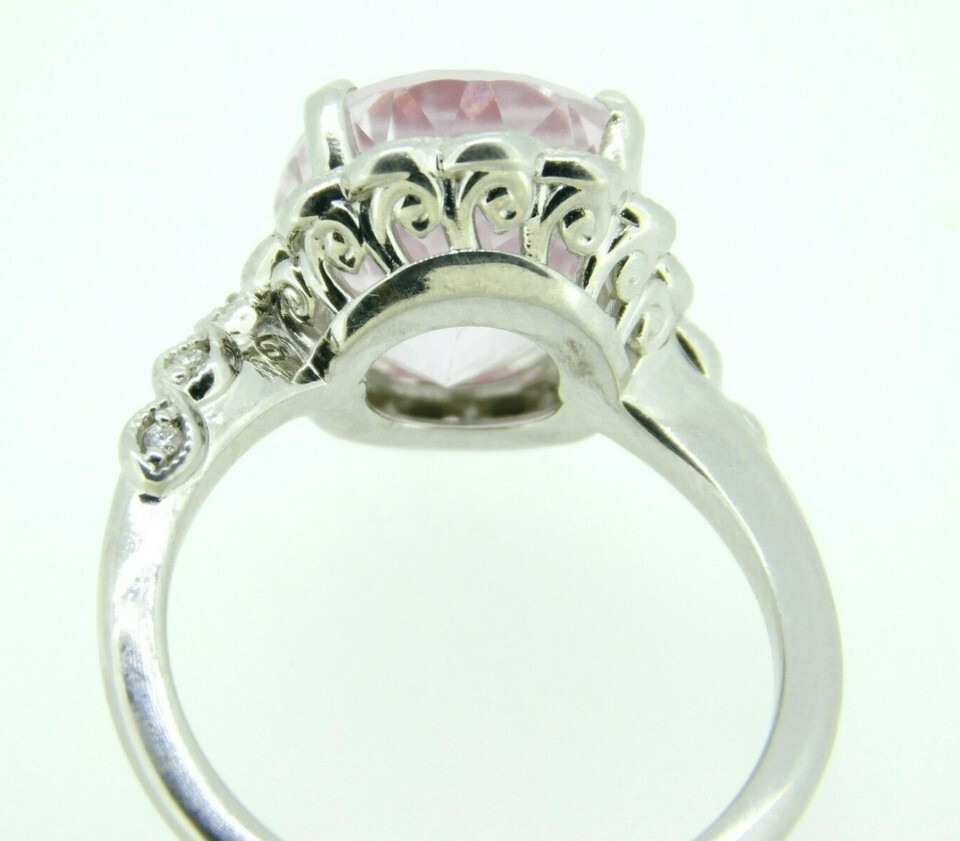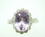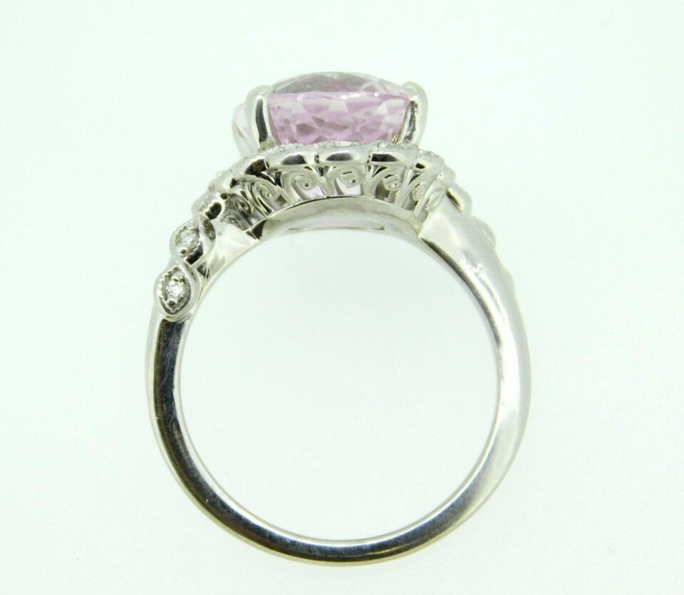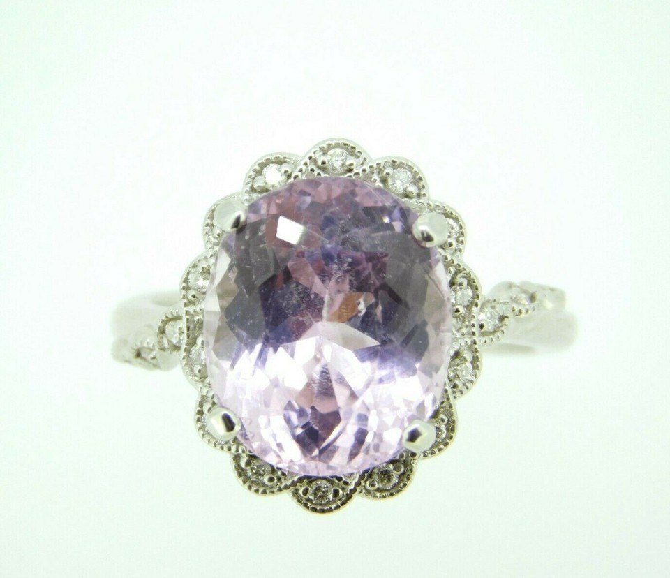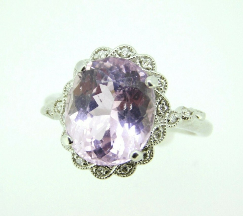 14k white gold kunzite ring with a diamond halo accent. The large oval kunzite is a light purplish-pink color and weighs 6.95 carats. The kunzite measures about 12.7 x 10.6mm. The kunzite is accented by a halo of twenty diamonds measuring 1mm and weighing .15cts total.