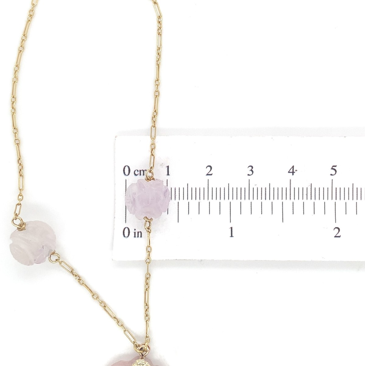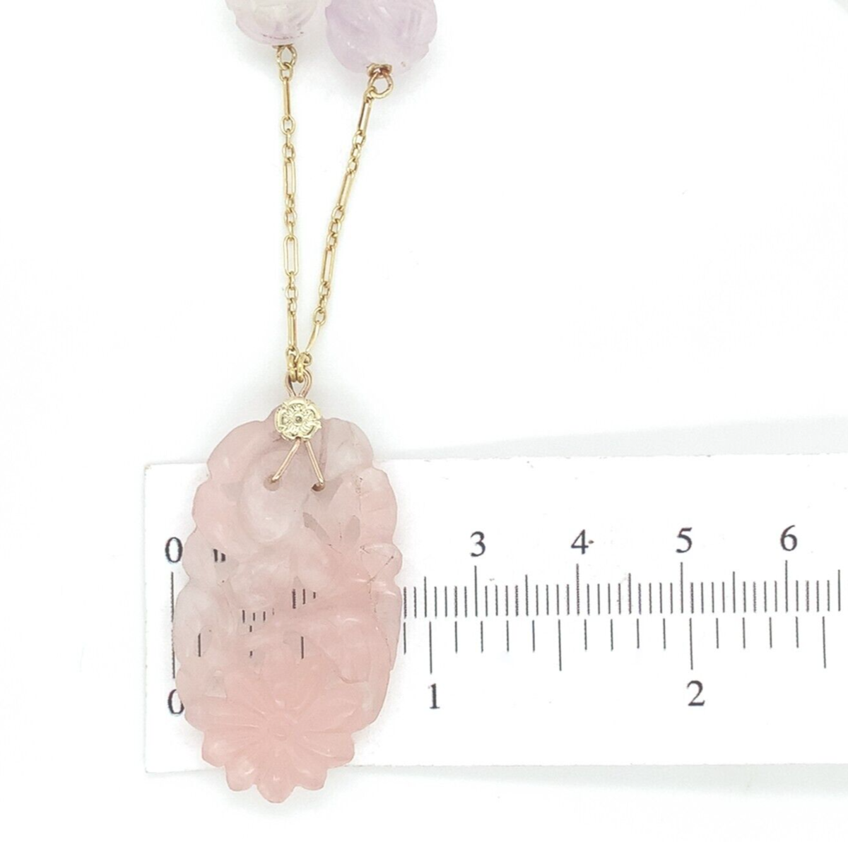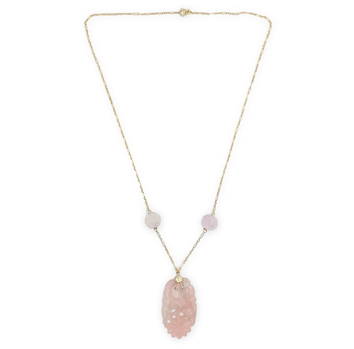Art Deco Chinese export 14k yellow gold necklace featuring carved rose quartz. There are two round 10.5mm beads that are set in the chain. The beads are more of a clear - rock crystal to pale lavender - amethyst color. There is an oval carved rose quartz measuring about 40mm x 22mm or 1 1/2" long by 7/8" wide. The rose quartz is carved with a flower and has a flower on the bail. The wearable length with the original paperclip chain is 18".