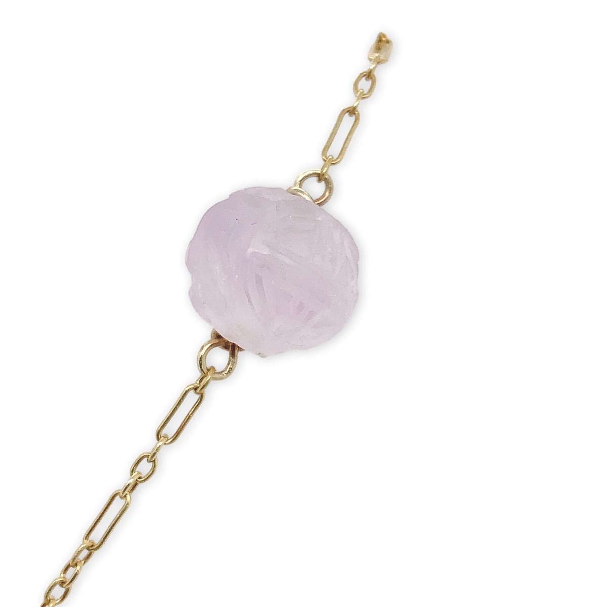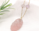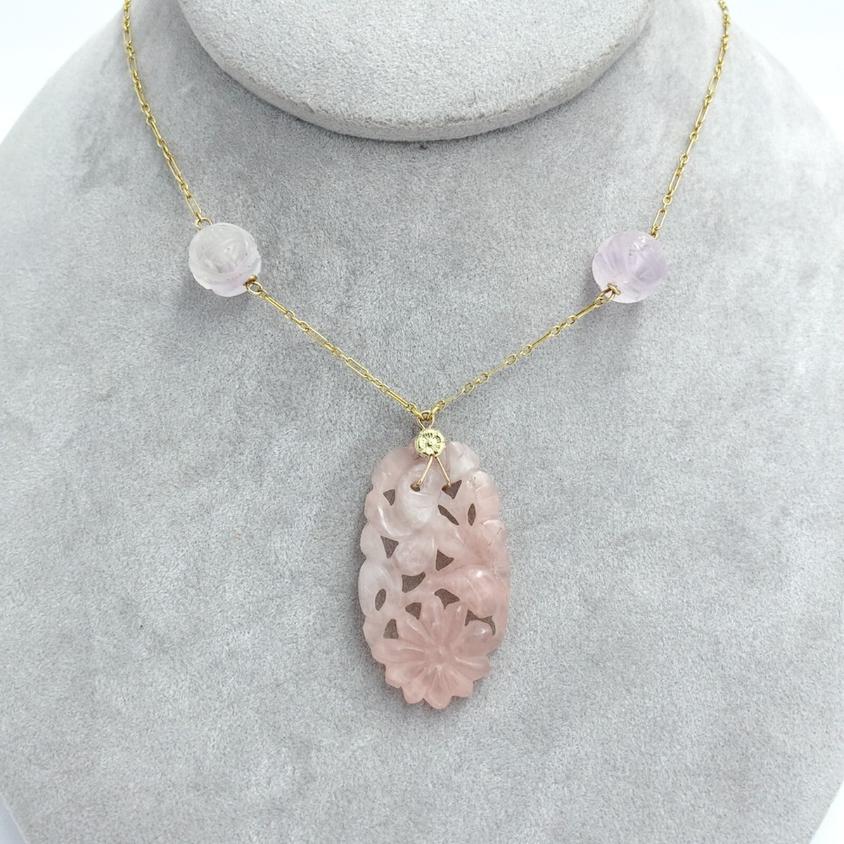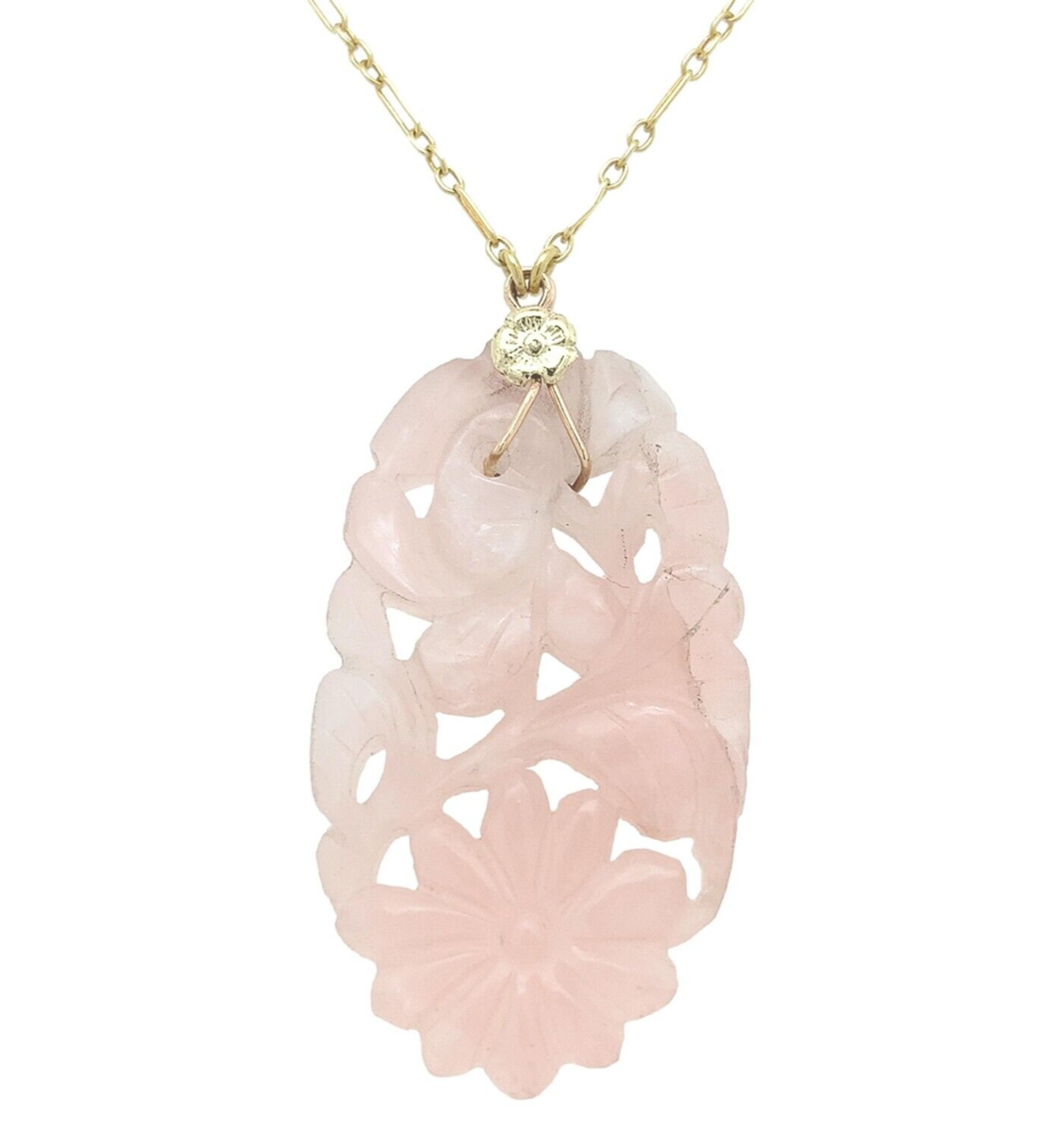 Art Deco Chinese export 14k yellow gold necklace featuring carved rose quartz. There are two round 10.5mm beads that are set in the chain. The beads are more of a clear - rock crystal to pale lavender - amethyst color. There is an oval carved rose quartz measuring about 40mm x 22mm or 1 1/2" long by 7/8" wide. The rose quartz is carved with a flower and has a flower on the bail. The wearable length with the original paperclip chain is 18".