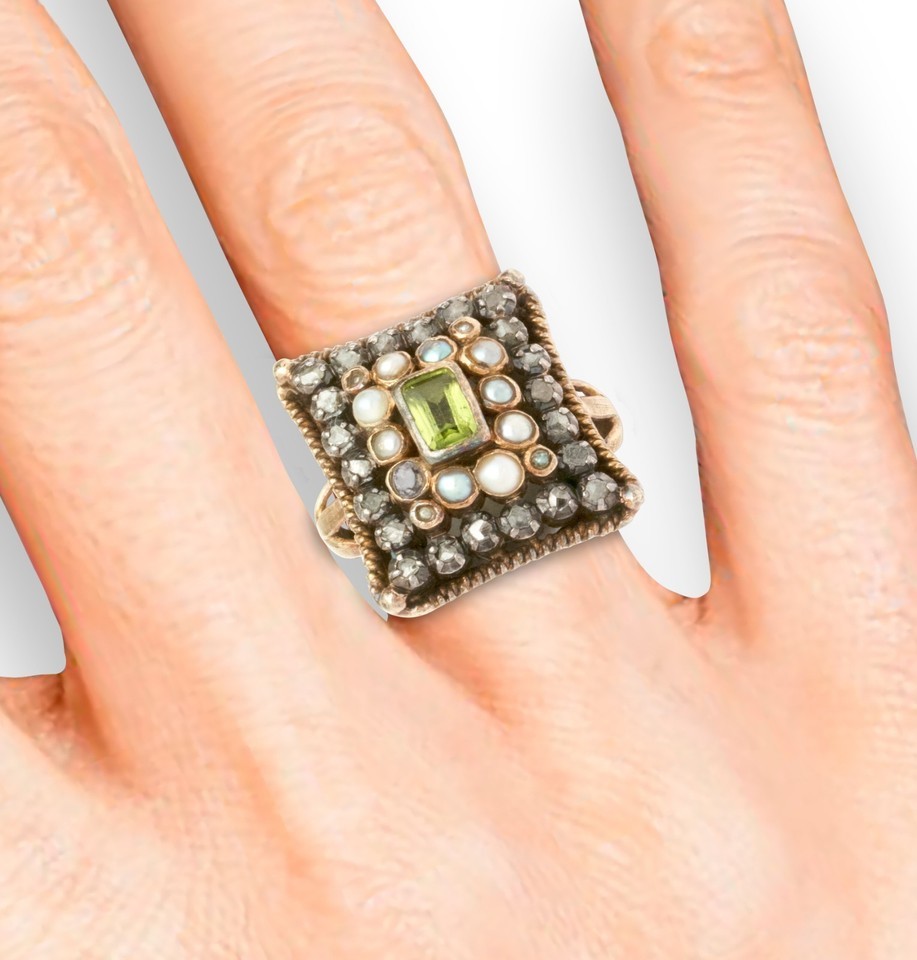 37 GEMSTONE CLUSTER PEARLS DIAMONDS 11g 19KHallmak GOLD RING 6.5 VINTAGE ENGLAND