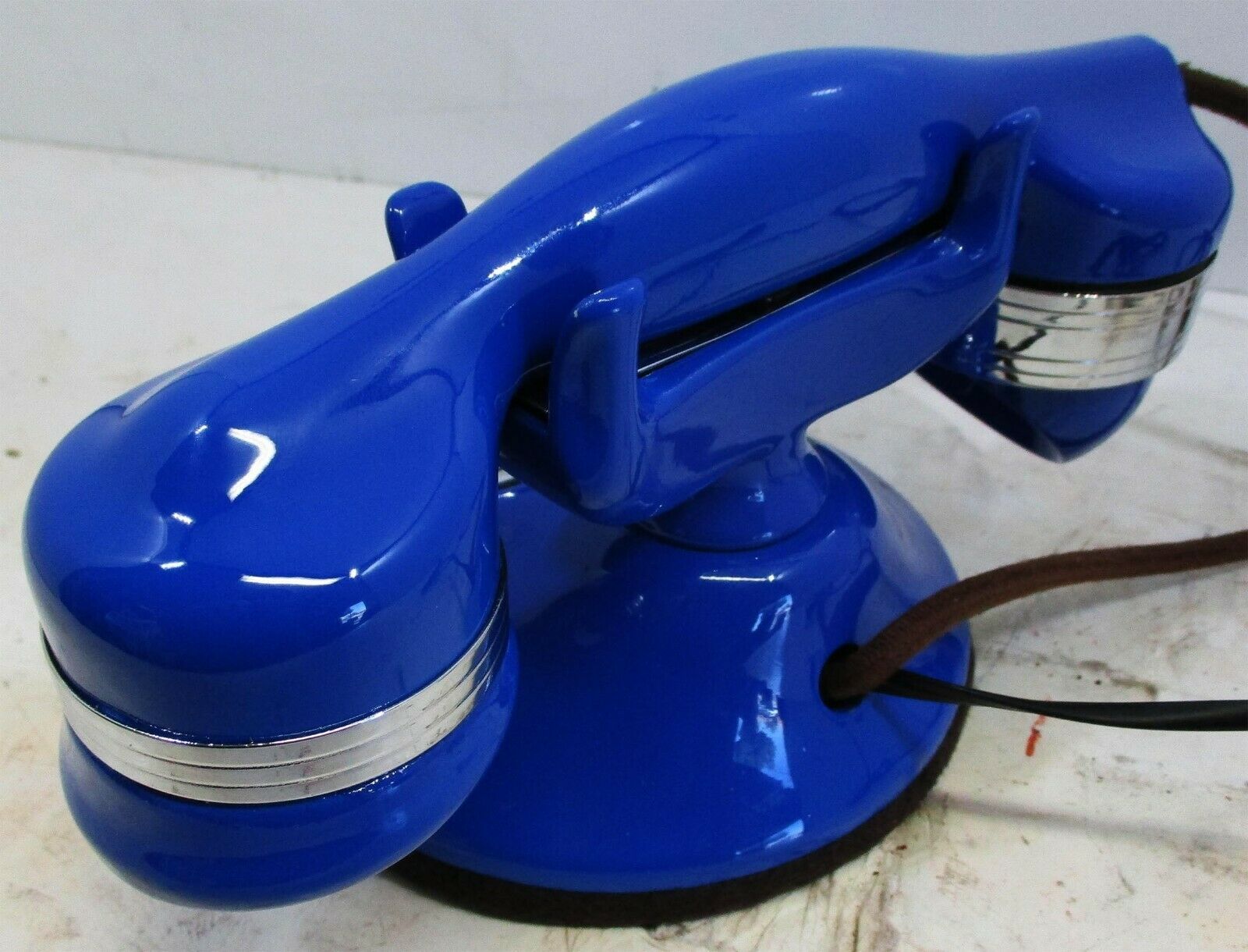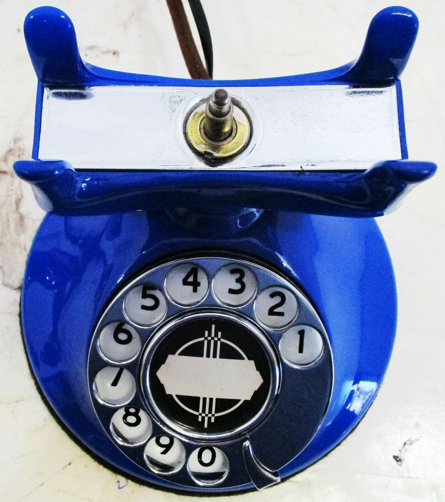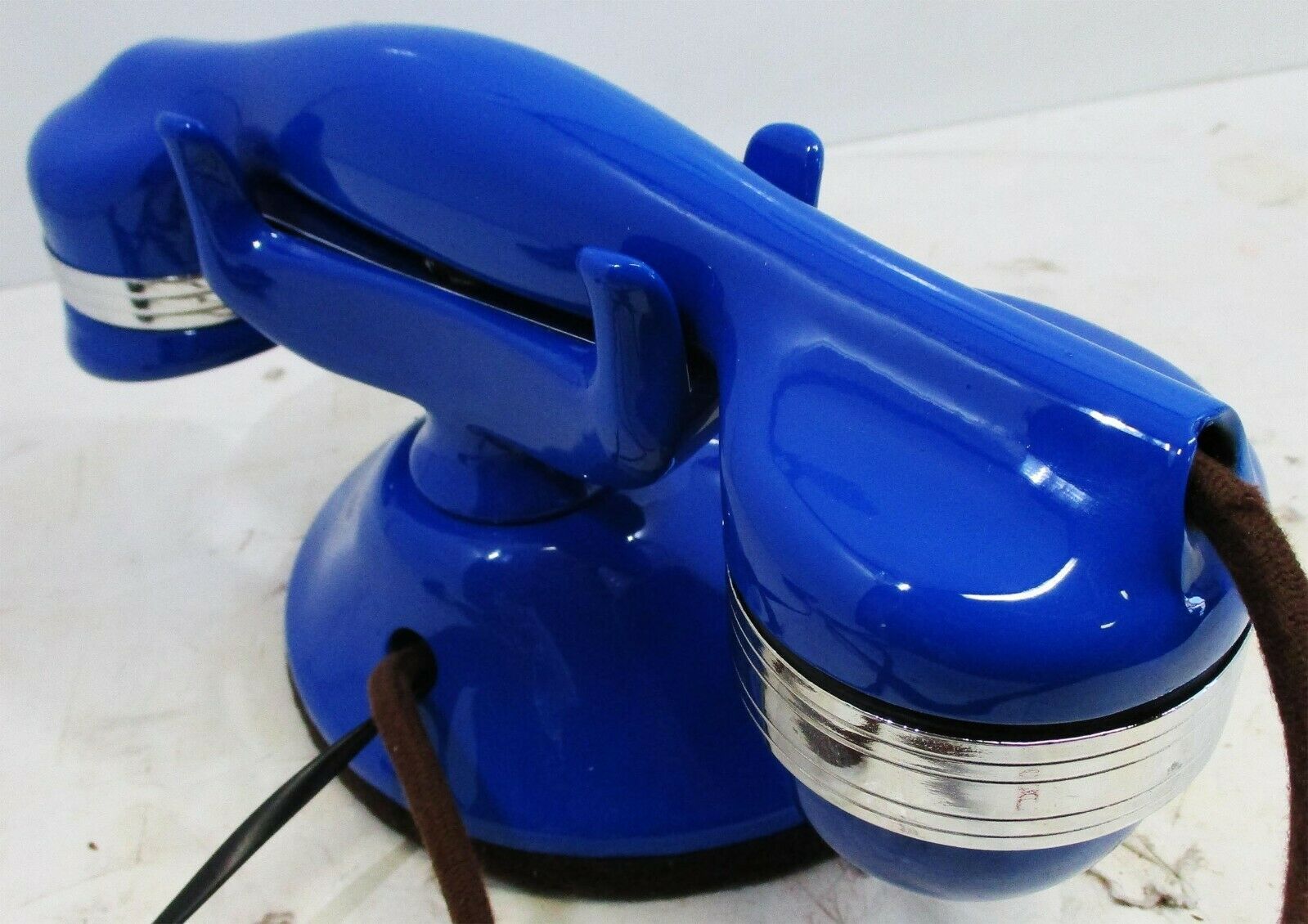 Features a brass rotary dial, bakelite base handset , brass trim, cloth covered cords, unique blue finish and fully operational.