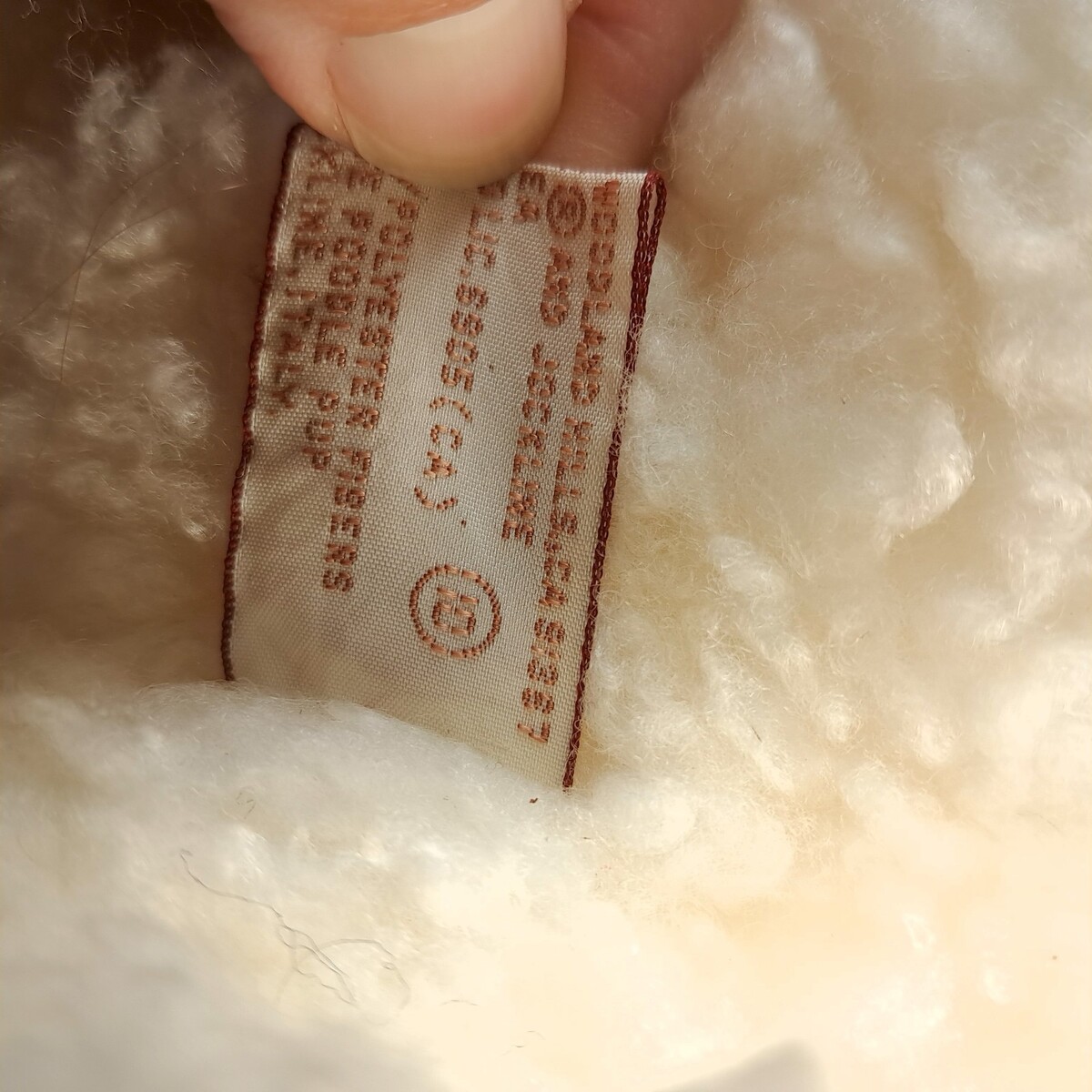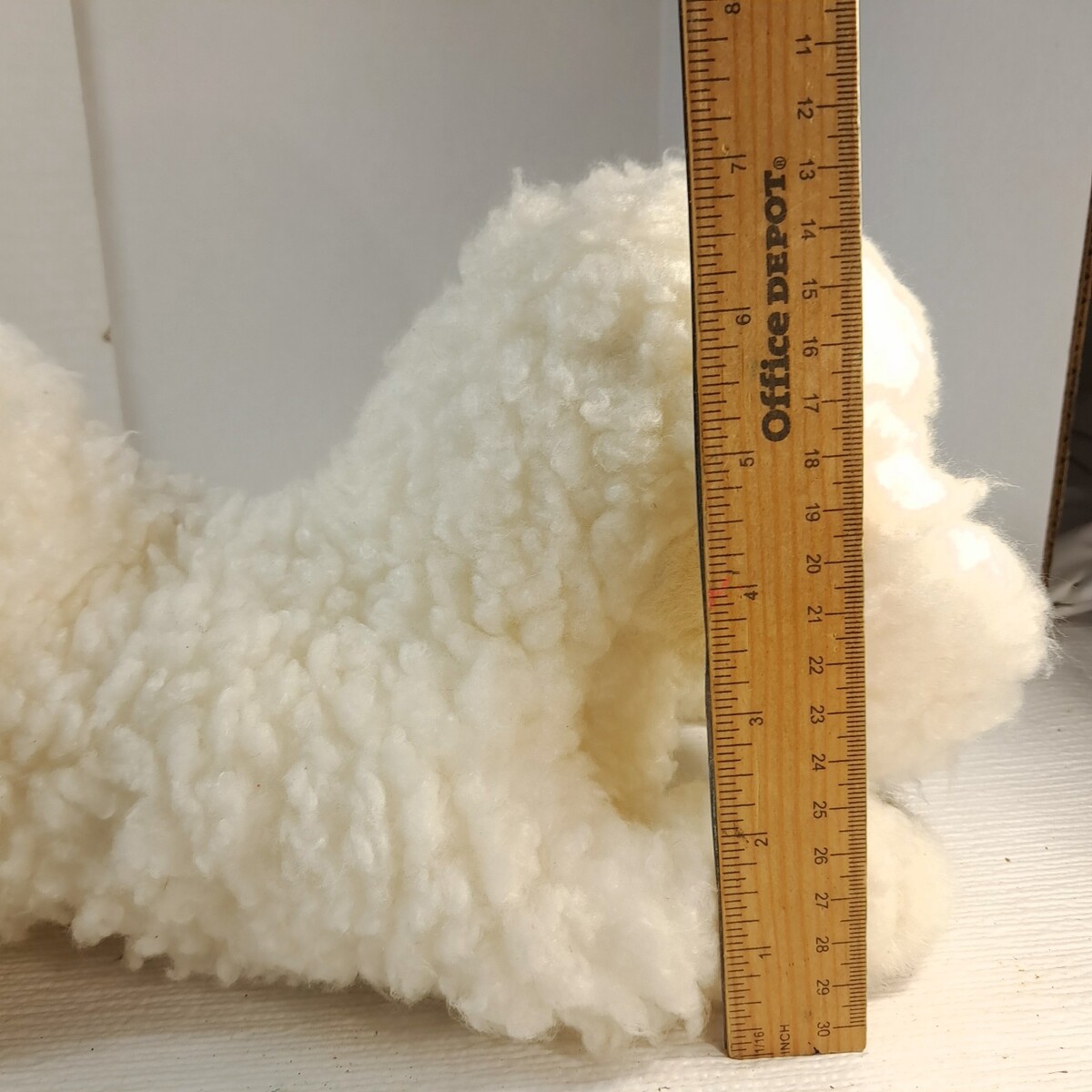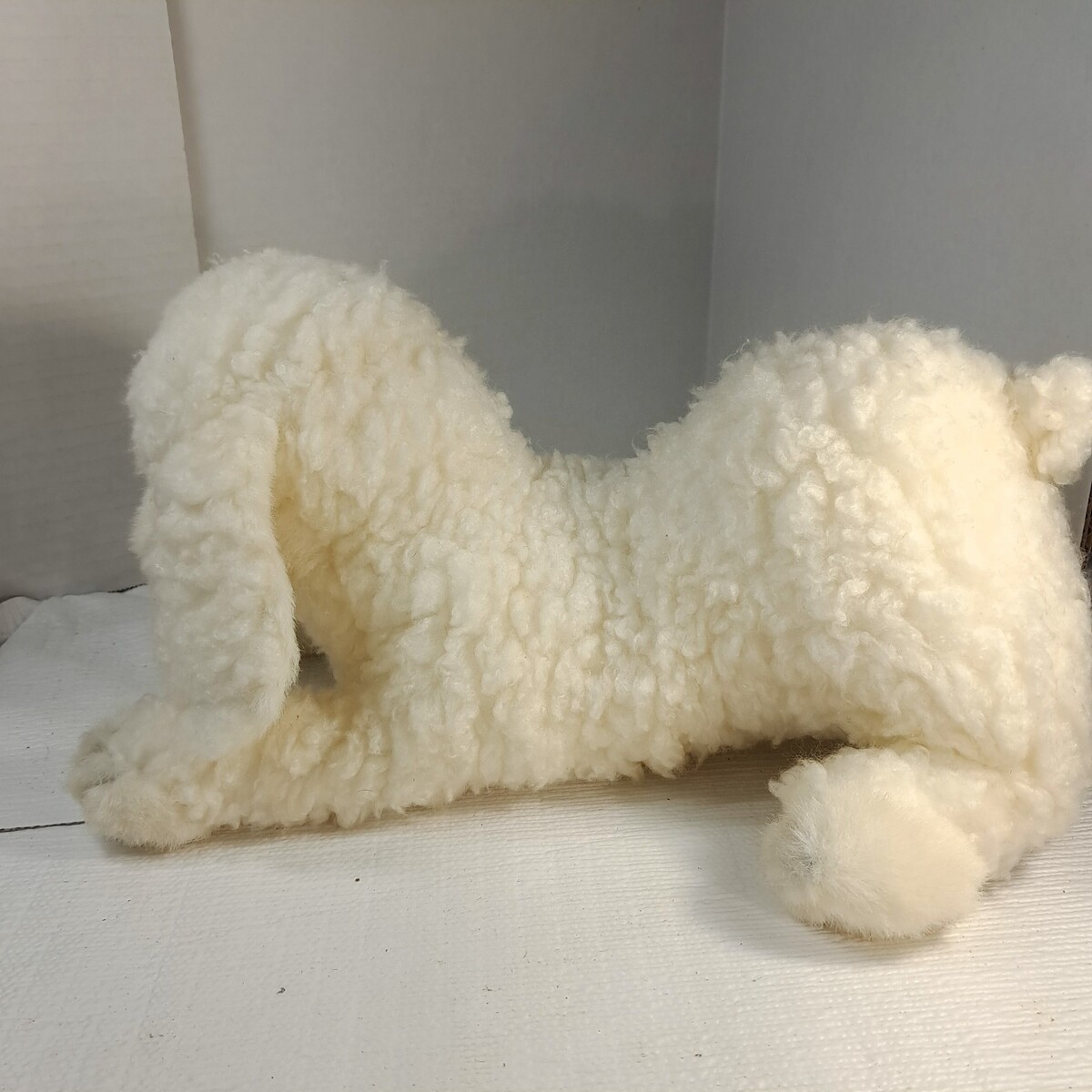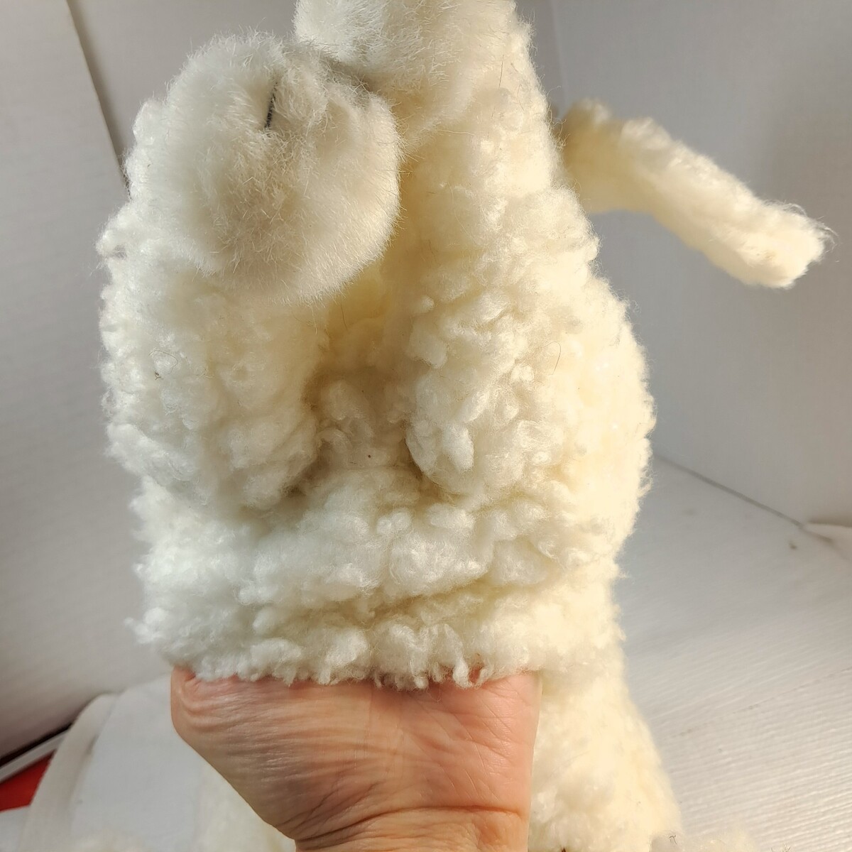 Puppet style plush. Curly fur in white/cream off white color.