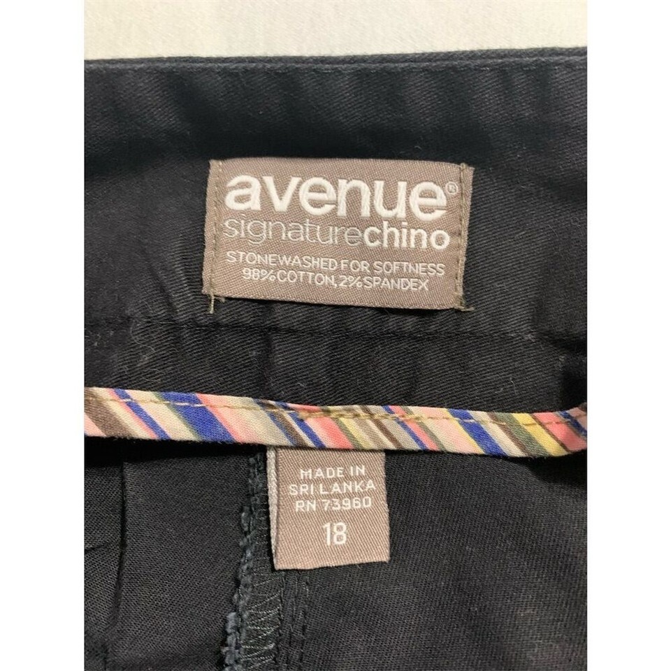 The Avenue Chino pants are designed for plus-size women, featuring a comfortable pull-on closure. Made from 98% cotton and 2% spandex, these black chinos offer a casual style with a stonewashed finish and stretch fabric for added comfort. Manufactured in Sri Lanka, they are machine washable for easy care. The pants are pre-owned. Keywords: Avenue, Chino, plus size, black, women's pants, casual, stonewashed, stretch fabric, cotton, spandex, pull-on, Sri Lanka, machine washable, pre-owned.