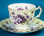 Aynsley Violette Yellow cup and saucer in very lightly used condition, Crocus shape. The cup and saucer are decorated with sweet violets and have a yellow band and gold trim on a scalloped rim. The saucer is 5-1/2" in diameter. This fine English bone china was made in England.