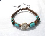 AZTEC DESIGN SILVER ALLOY ROUND BEAD WITH BROWN WOOD AND BLUE BLACK HOWLITE BEADS ON BROWN COLOR CORD MACRAME WEAVE