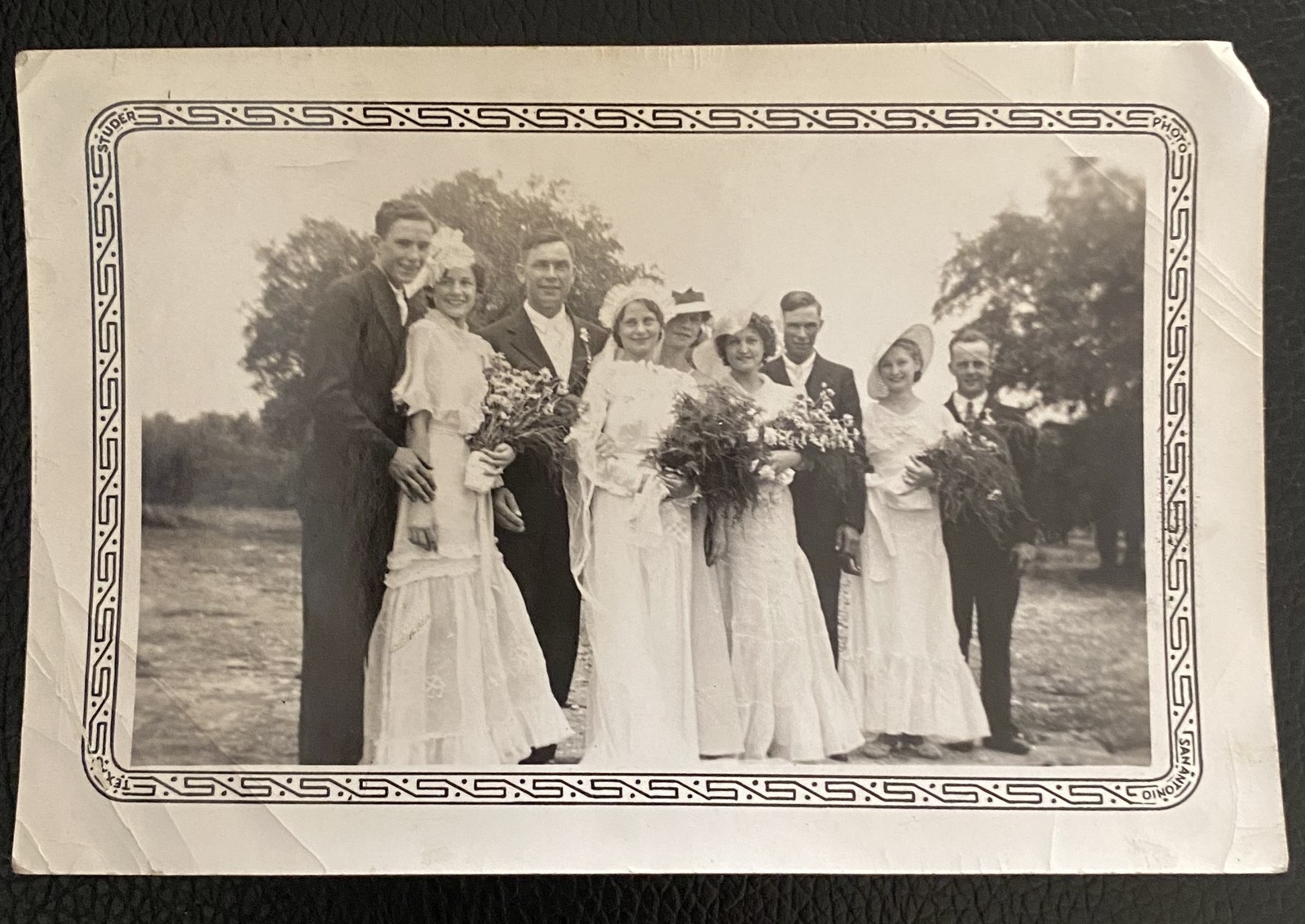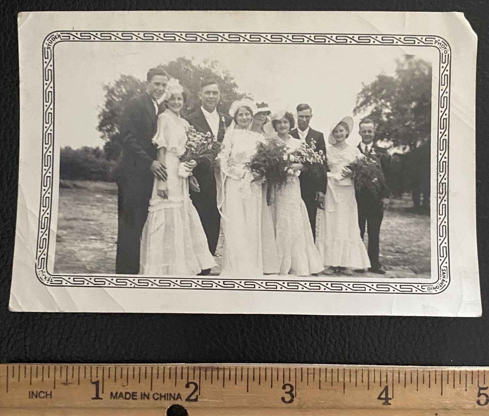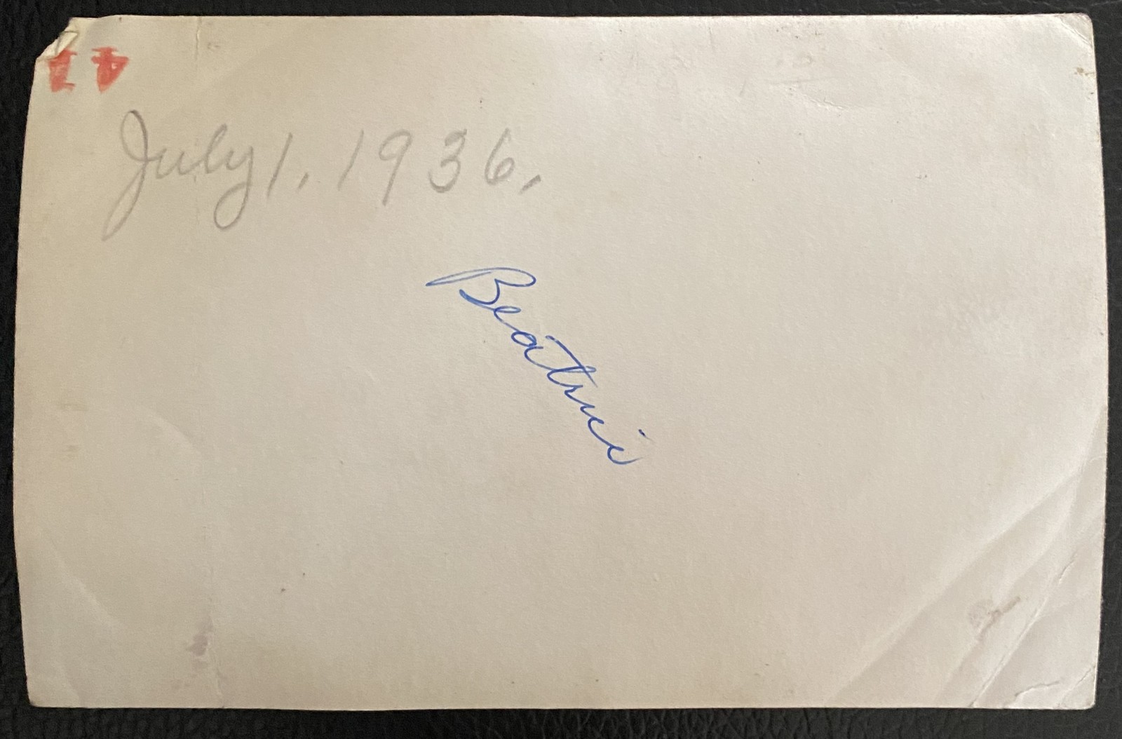 This listing features a Black White Photograph of a wedding that has Beatrice hand written on it's backside as well as the date; July 1, 1936. This photo was taken and then mounted by the world famous Studer Studios who, back in the 1930's to 1940's, practically invented the custom commercialized studio mount that emphasized the studio name; "Studer Studios" within it's graphic design (please see images).