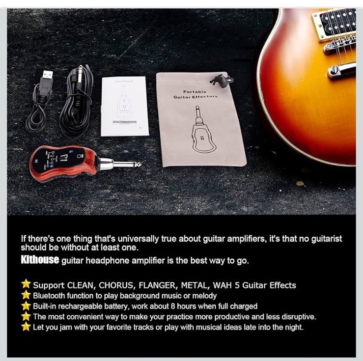 The B6 Guitar Headphone Amp by Kithouse is a powerful 5-watt amplifier designed specifically for guitarists. This mini plug amplifier is compact in size and easy to use, making it a convenient option for practice sessions or small gigs. It features Bluetooth connectivity for added versatility, as well as 5 built-in effects to enhance your sound. The stylish mahogany color and durable metal construction make it a reliable and stylish choice for any musician. Power source is battery-powered, and 1 lithium polymer battery is included with the product.