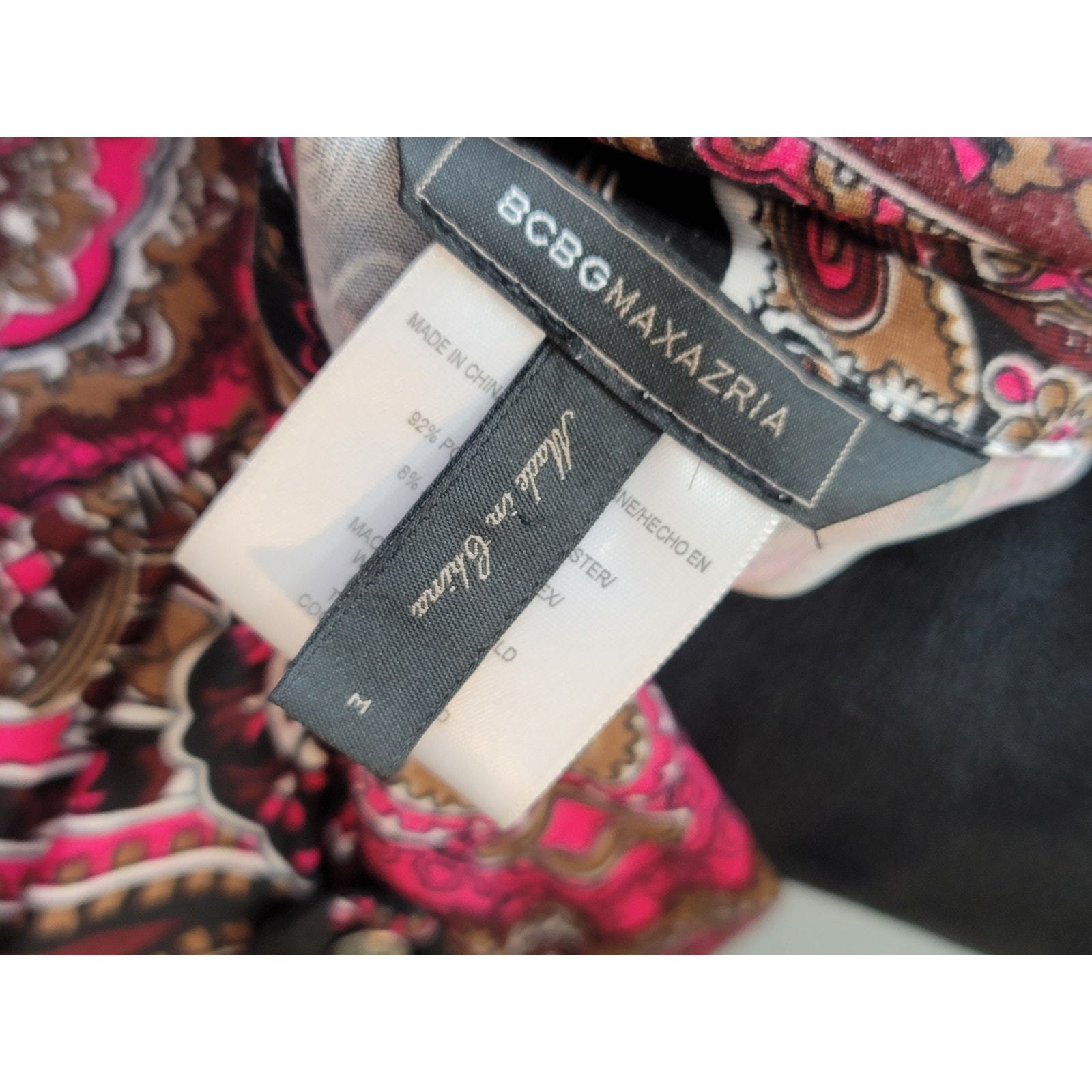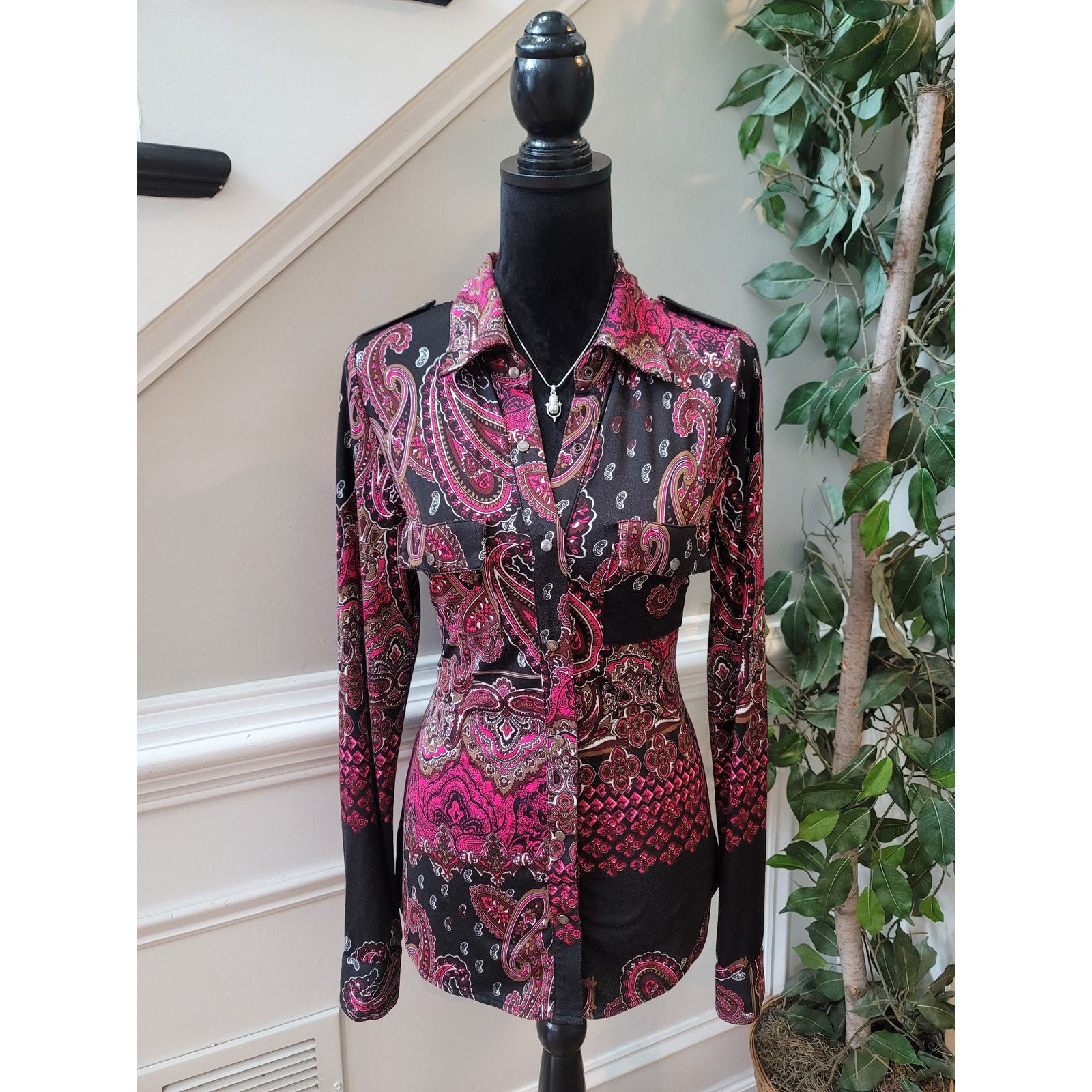 BCBG Max Azria blouse in a striking black and pink paisley print. Featuring a button front, collared neckline, and long sleeves, this fitted blouse offers both comfort and style. Made with a soft polyester spandex blend, it provides a flattering silhouette perfect for work, evenings out, or casual chic looks.