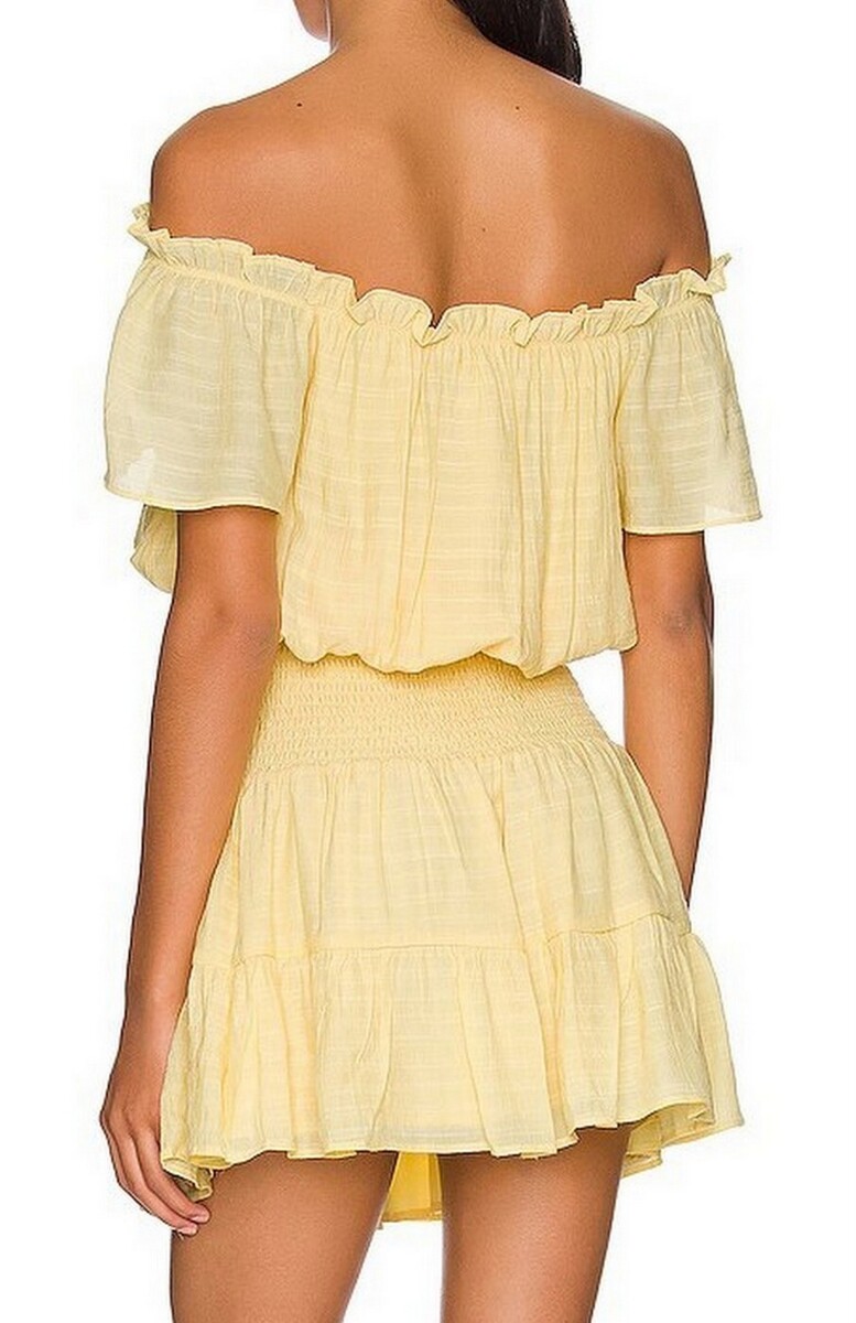 Bring sunshine wherever you go in BCBGeneration's darling dress, a textured design in a fit and flare silhouette finished with a romantic off-the-shoulder neckline. The dress boasts an elegant and feminine design with an elasticized ruffle neckline, flutter sleeves, and a smocked waist