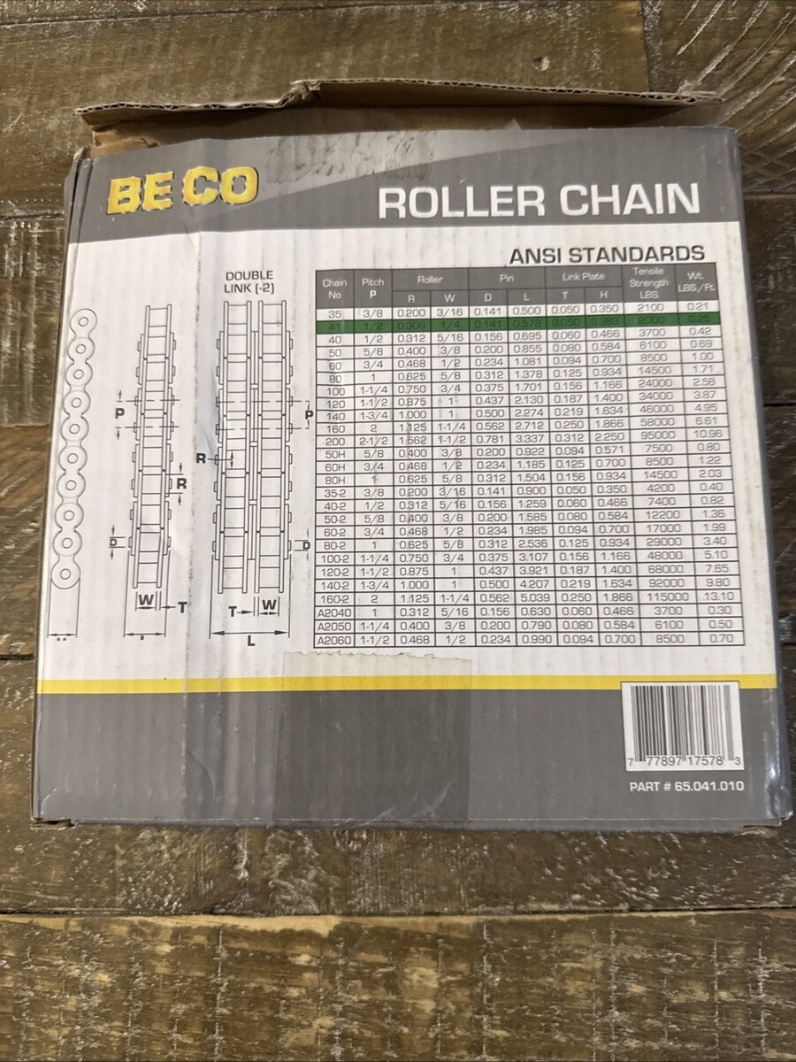 The BE CO Roller Chain is a high-quality industrial product designed for mechanical power transmission. With a 1/2" chain size and 41 pitch, this roller chain is durable and reliable for various industrial automation and motion control applications. The BE CO brand ensures that this chain is manufactured with precision and attention to detail, making it a valuable component for any machinery or equipment requiring efficient power transmission.