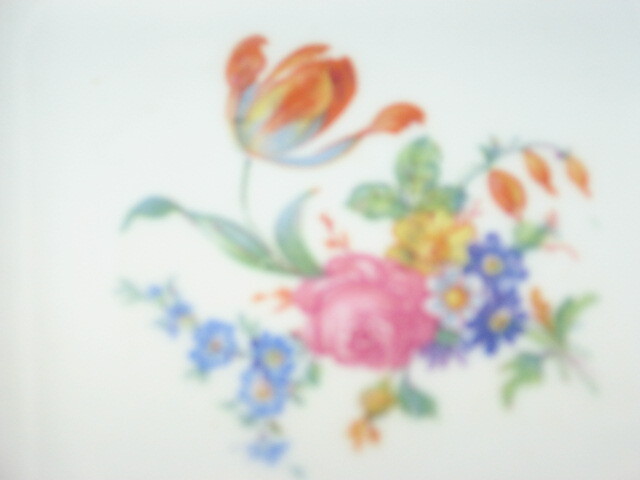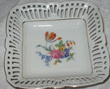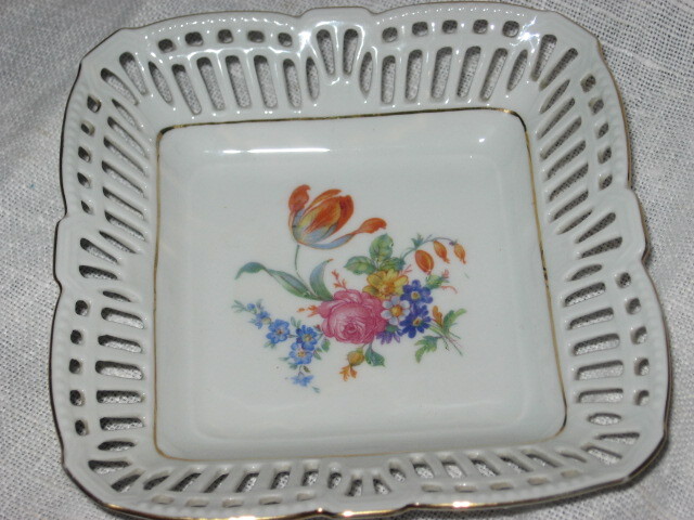Too pretty to hide away! This delicate reticulated porcelain plate has a colorful floral display of pink, purple and yellow. Not unnoticed is a striking gold trim appearing on the edge and on the inside. The maker's mark indicates item was produced in the US occupied zzone in Germany 1945-1949. Measures 5.5" X 5.5" X 1.5" deep No flaws or crazing. Use it to catch your important trinkets, pieces of jewelry or fill with treats for guests. Look for other German items in my booth.
