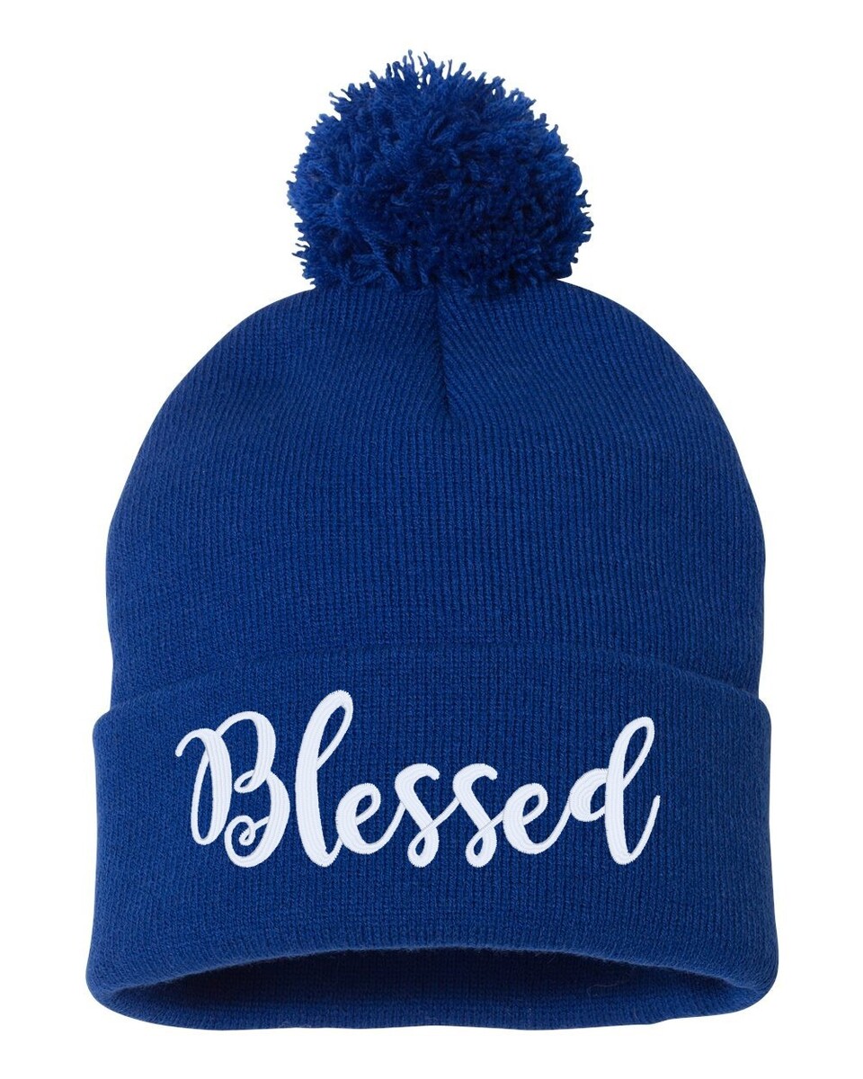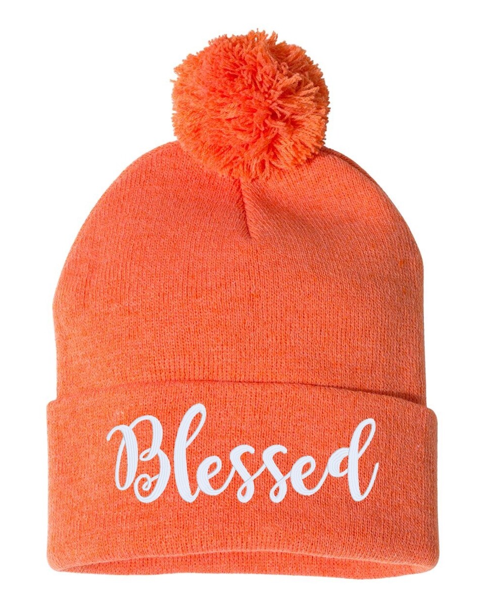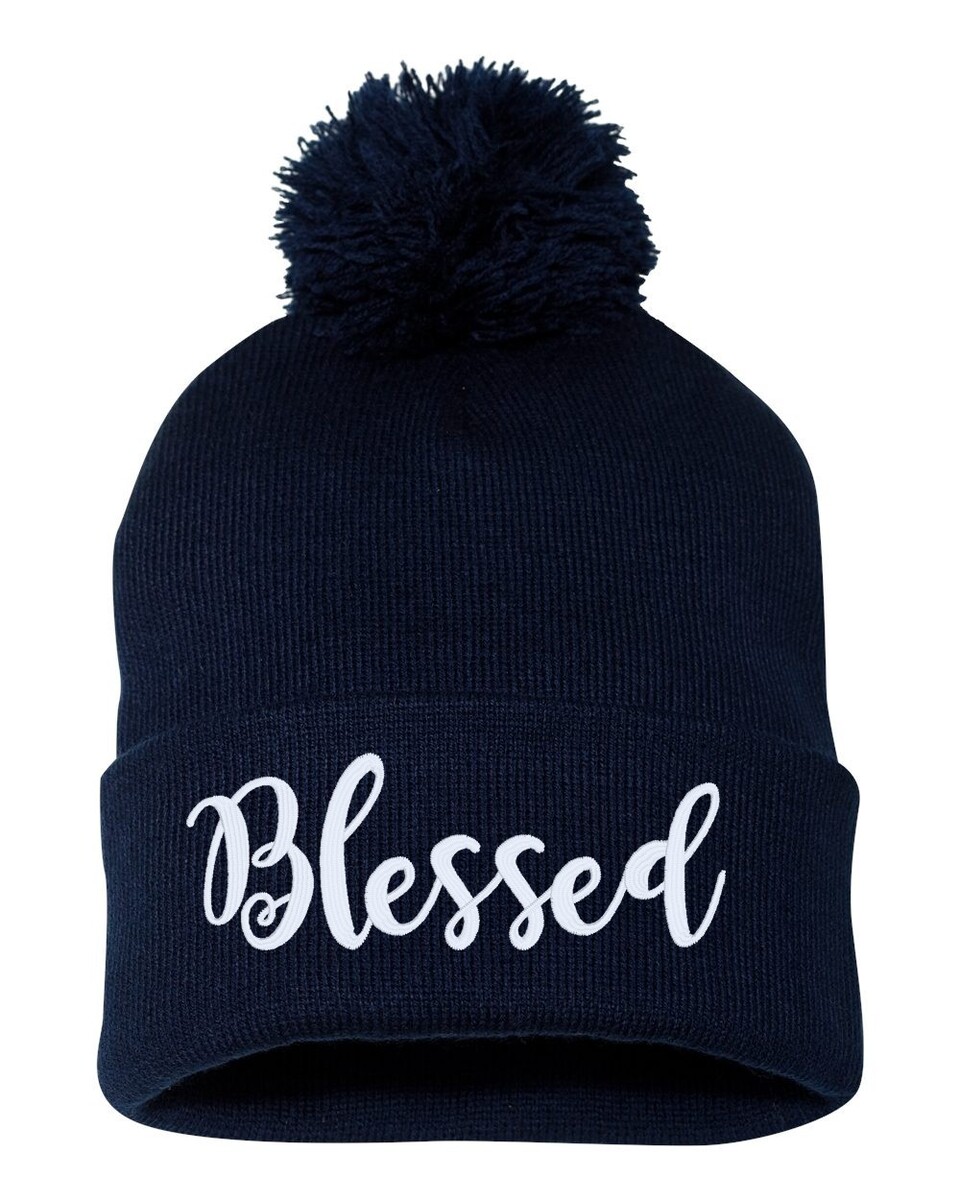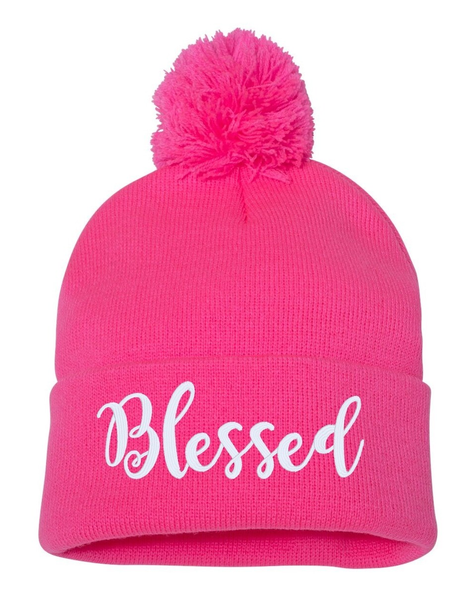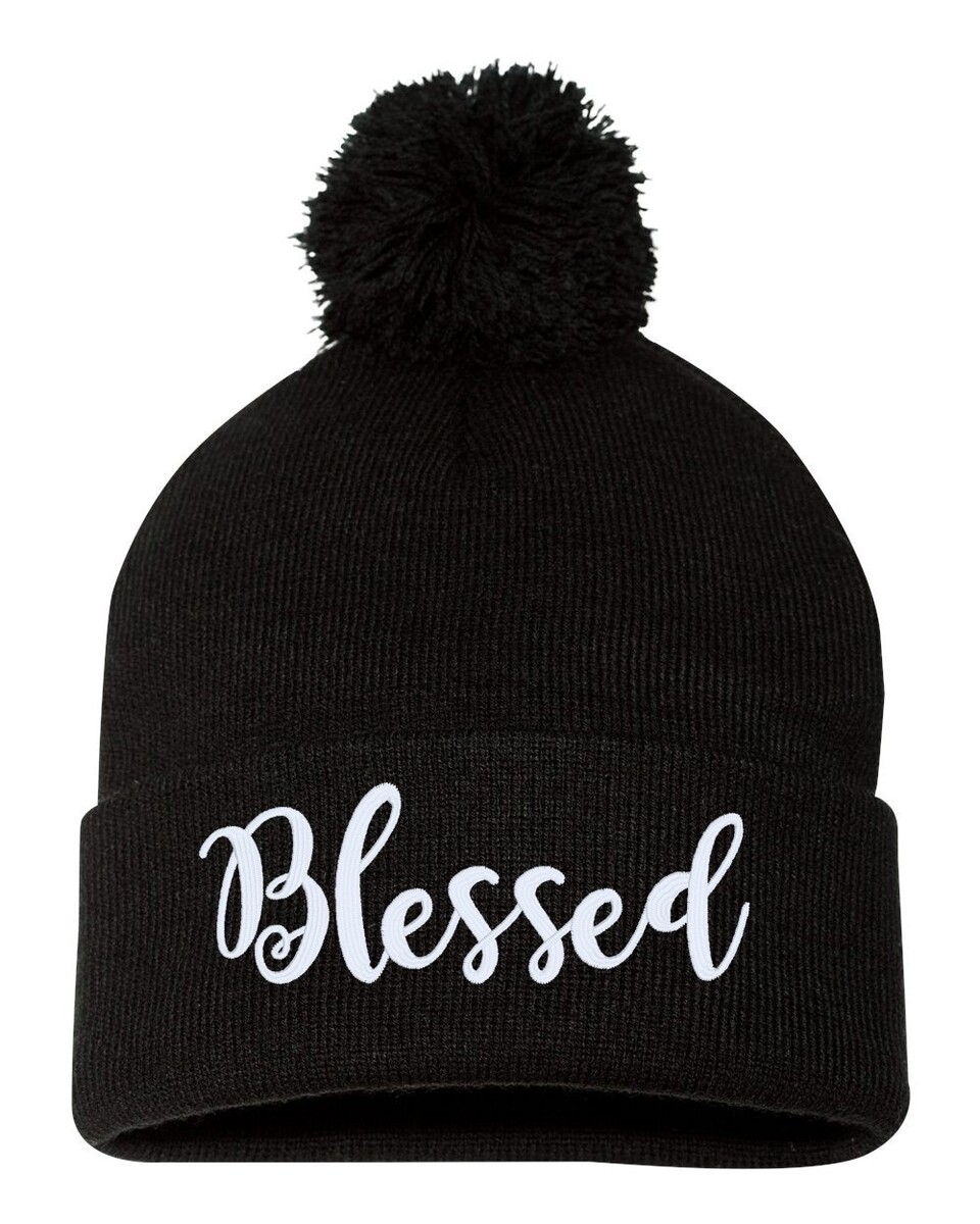 - BLESSED Script Embroidered Cuffed POM Beanie Hat, Embroidered Gift, Winter Hat
