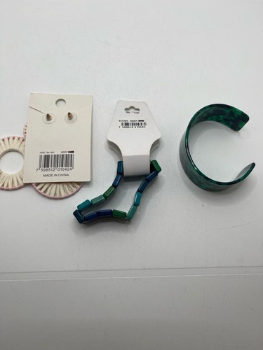 The product is a lot of Coco Beau accessories that includes an earring, two bracelets, , all in shades of blue, green, and tan. The accessories have a beach theme and feature beaded accents, perfect for adding a touch of boho style to any outfit. The pieces are designed for women who appreciate solid colors and unique shapes, such as oval, to make a statement with their accessories.