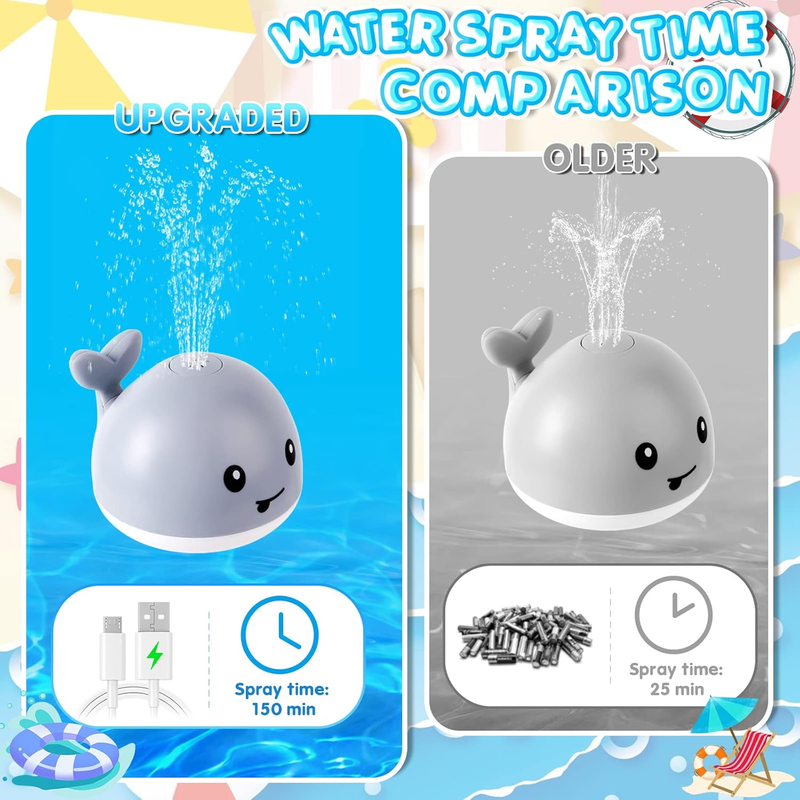 Safe Material and Save Money: This baby bath toys for toddlers 12-18 months are made of high quality ABS plastic, designed with a cute whale, round and smooth edge, and friendly to your baby. And the battery compartment is sealed by a rubber band to prevent leakage. A rechargeable Battery can spray water for 150-minutes after being fully charged, which is 4 times that of 3*AAA battery. Save you extra battery costs and protect the environment, do not need to waste new batteries anymore