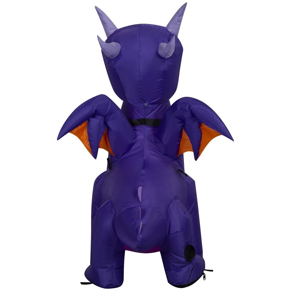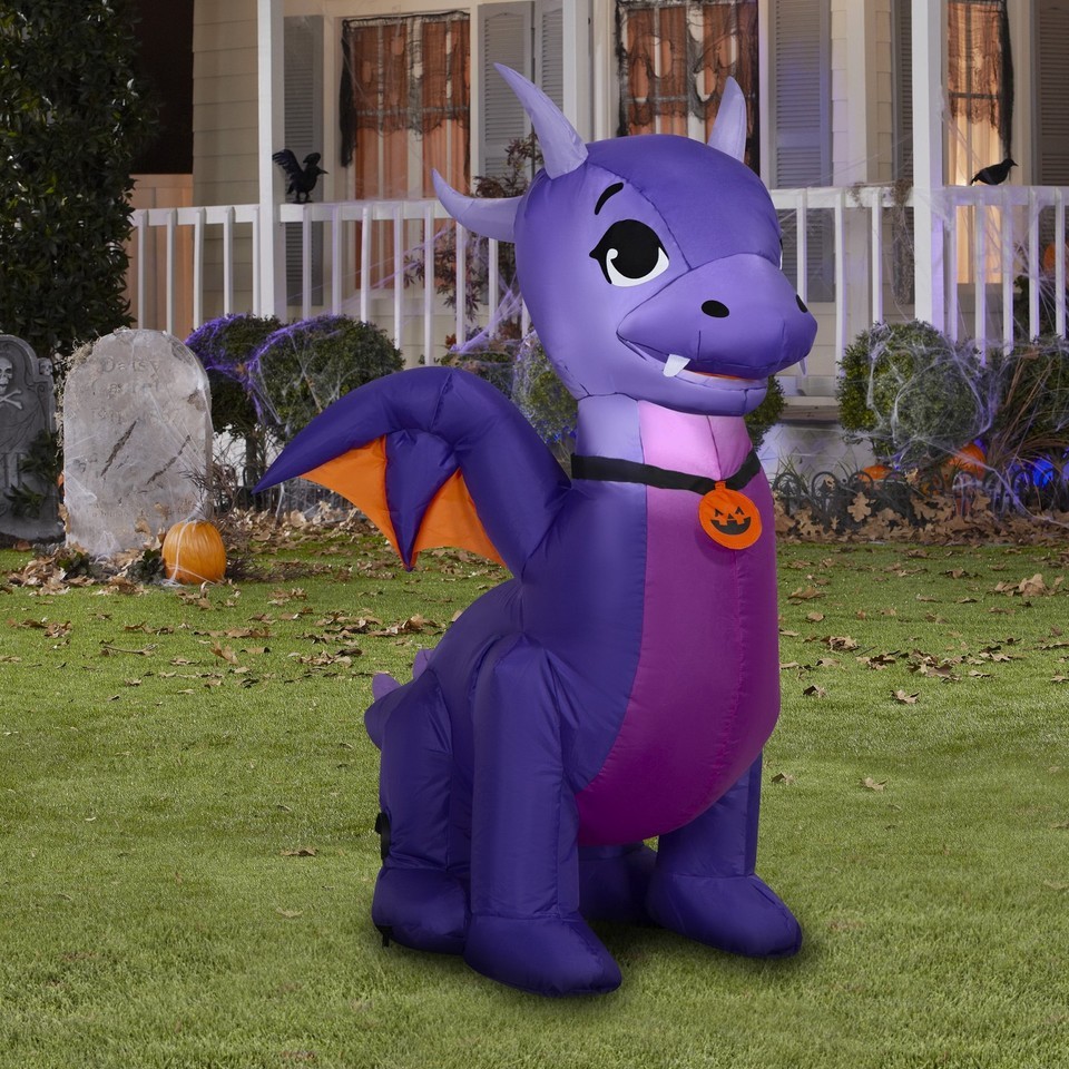 Way To Celebrate Halloween Baby Dragon Airblown Yard Inflatable, Purple, 3.5' Features a purple baby dragon with red wings and jack-o'-lantern collar Lights up from within for a magical nighttime effect Stands 3.5 feet tall for the perfect playful accent Self inflates in seconds for fast and simple decorating Great for both indoor and outdoor Halloween displays