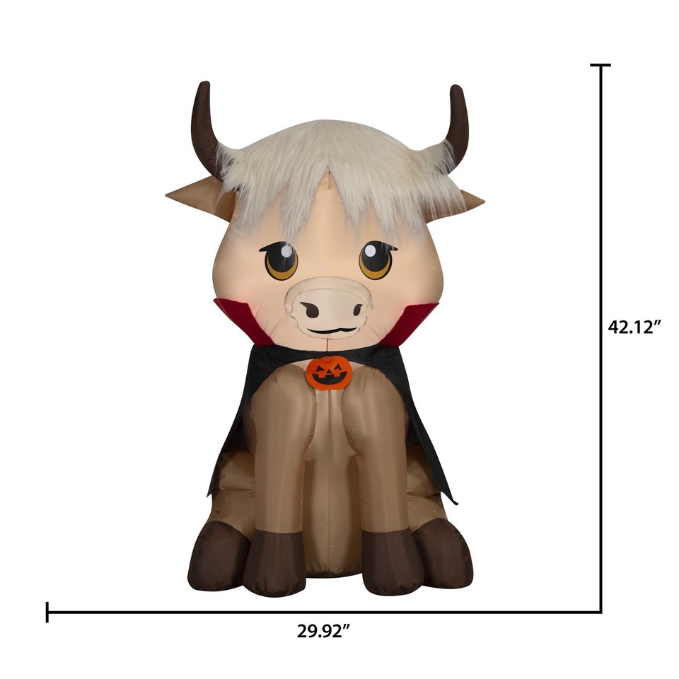 Way To Celebrate Halloween Baby Highlander Cow with Cape Airblown Yard Inflatable, Multicolor, 3.5' Features a baby Highland cow in a Halloween cape and jack-o'-lantern collar Lights up from within for glowing nighttime visibility Stands 3.5 feet tall for a friendly and festive presence Self-inflates in seconds for quick and easy decorating Perfect for indoor and outdoor Halloween setups