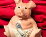 This adorable pink pig figurine by Wade England is not just a cute addition to your collection, but also a practical piggy bank. Made of high-quality ceramic material, it is an original vintage piece manufactured in the United Kingdom in the 1980s. It features a cute baby pig named Woody and was originally a promotional item for Natwest Bank.