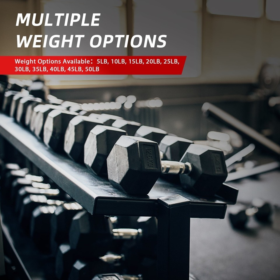 Build total-body strength with the easy-to-use BalanceFrom Rubber Hex Dumbbell. Resistance training is multi-beneficial, helping with total strength, stamina, bone health, calorie burn, and energy levels. Available in a wide variety of weight values from 5 pounds all the way to 50 pounds, the BalanceFrom Rubber Hex Dumbbell helps you create your very own customized weight set to complement your home gym (each weight sold in pairs). Choose your desired weight to accommodate a variety of exercises and users of different fitness levels. Additionally, each weight occupies minimal space in your home. The hexagonal rubber ends on each weight prevent your weight from rolling away or underfoot during your workout. And the partially-knurled chrome handle provides a non-slip grip so you can maximize your strength training routine without dropping your dumbbell.