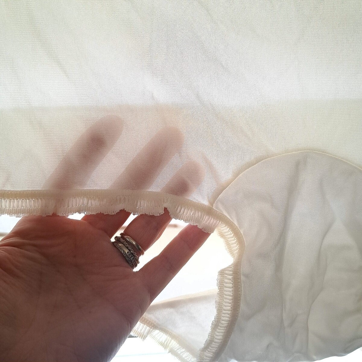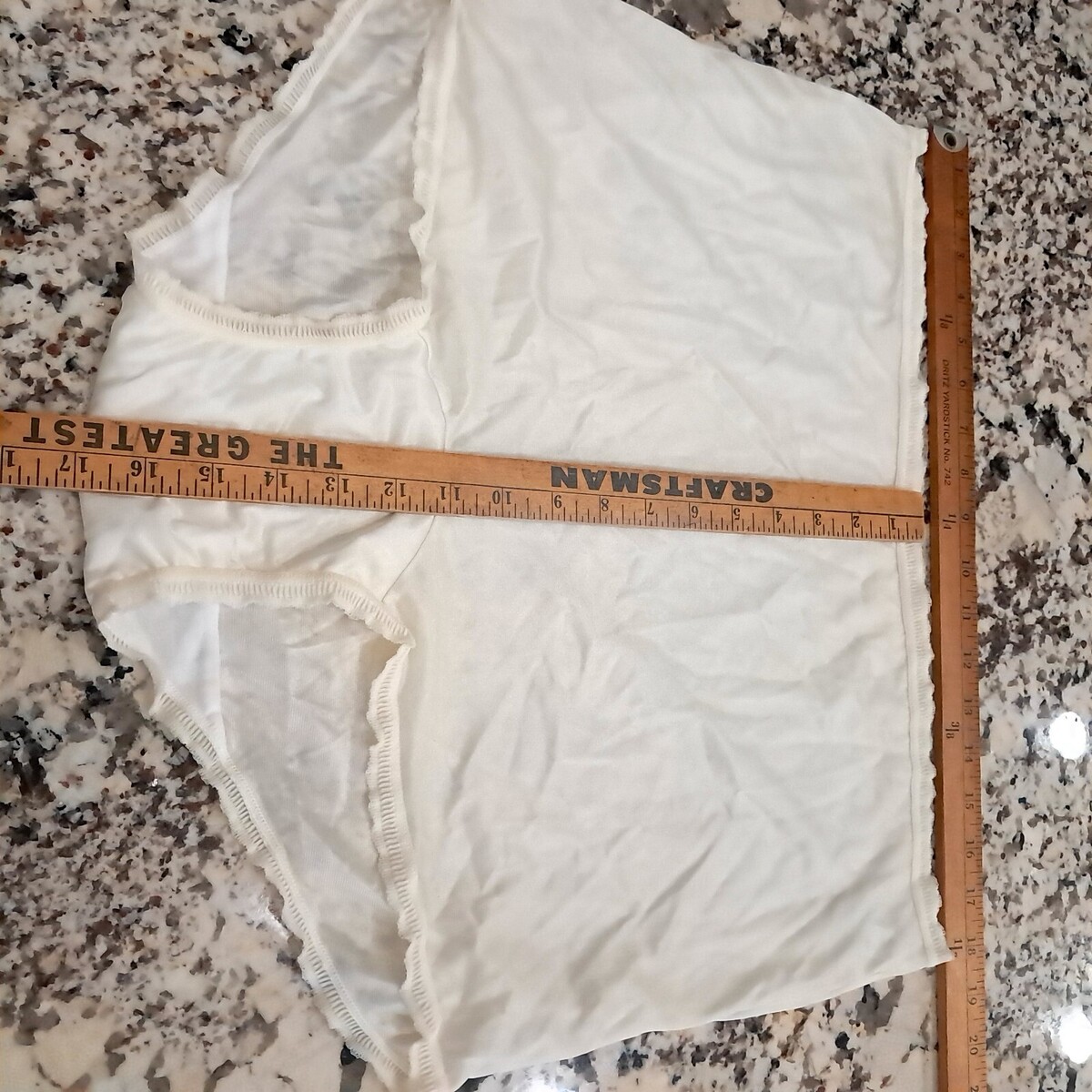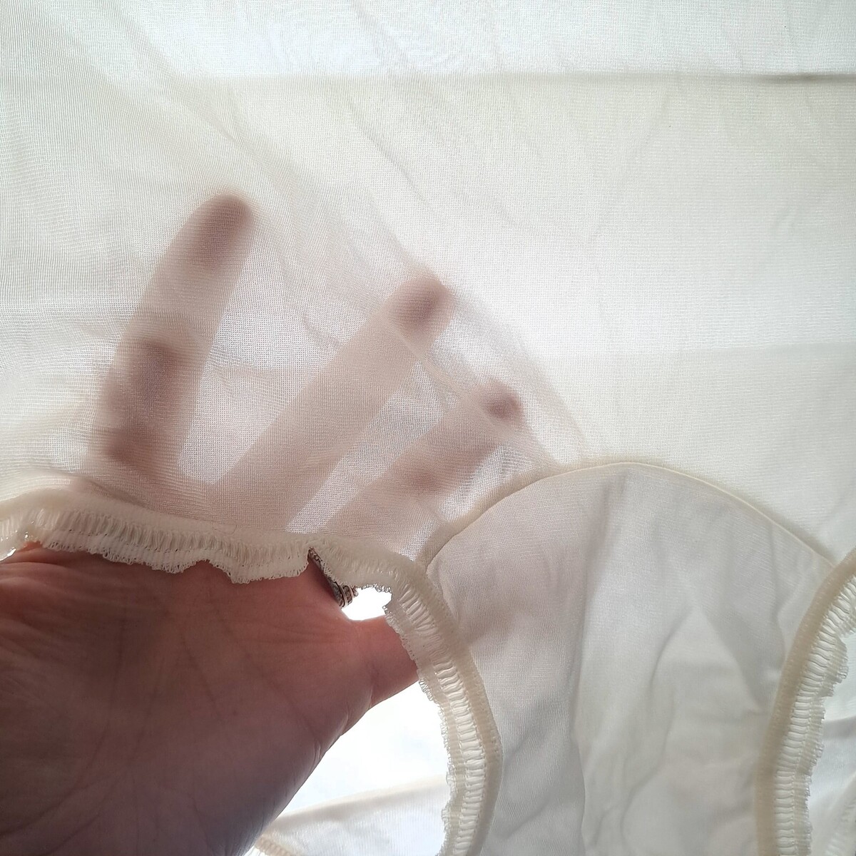 Color cream/ivory. Nylon granny panties that are sheer/semi sheer. I don't think these have ever been worn. These are marked size 9, but I'm not sure if the elastic has been stretched, they run large, or are mismarked. See pics for actual measurements.