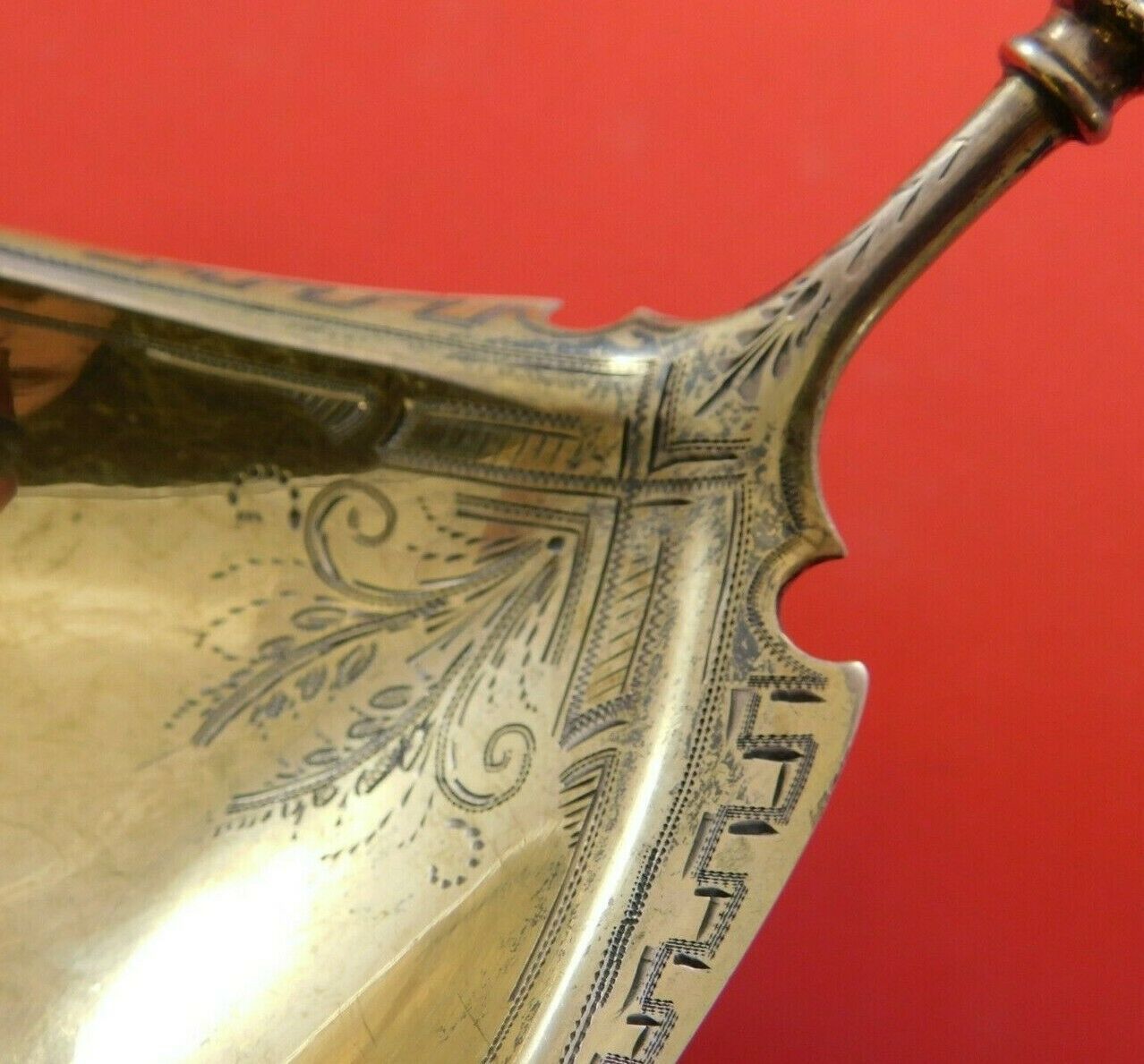 Sterling silver Soup Ladle Gold Washed and Bright-Cut 14 1/4" in the pattern Ball End by George Sharp. It is not monogrammed and is in excellent condition.