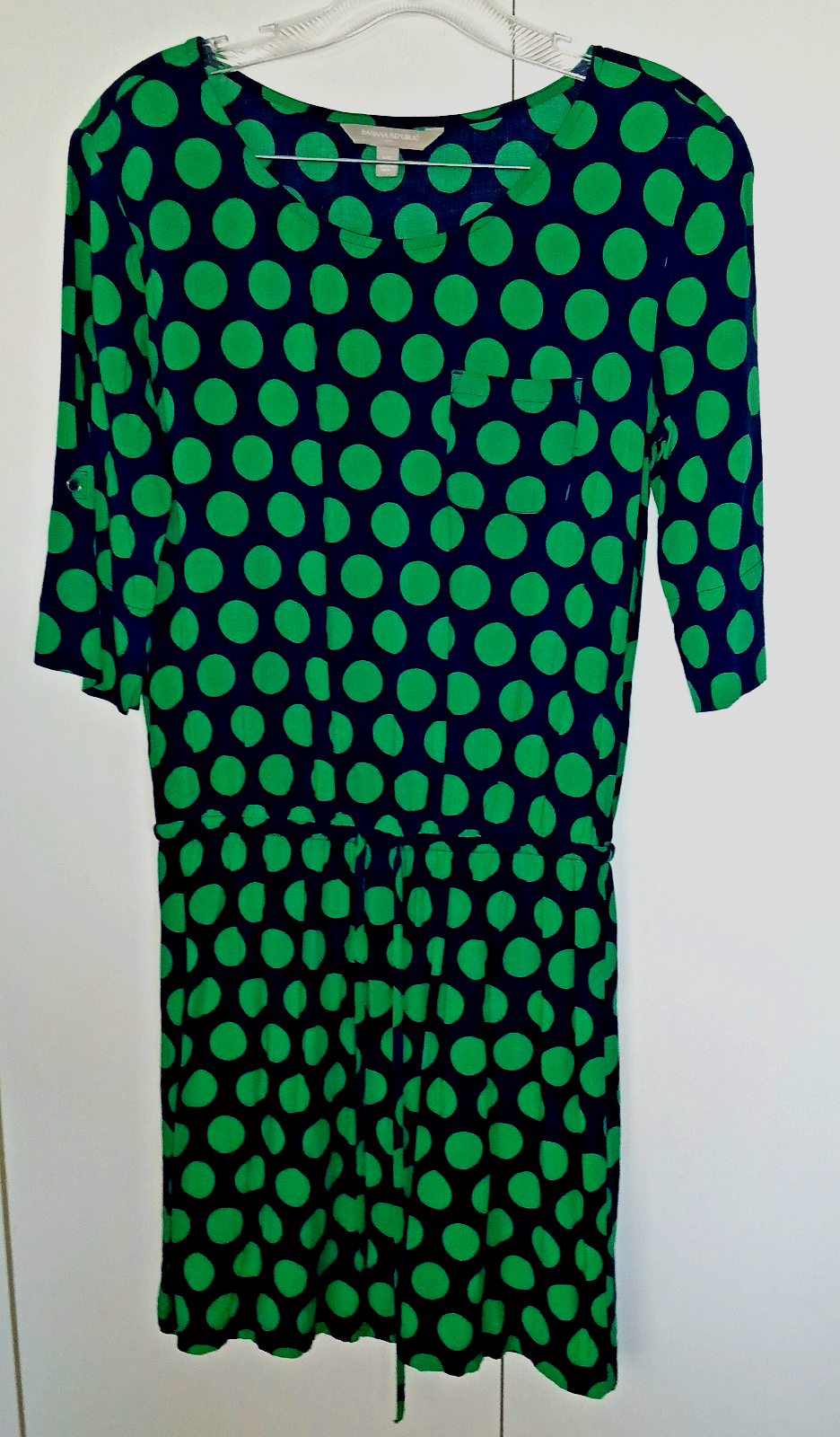THIS IS A CUTE BANANA REPUBLIC LADIES 3/4-SLEEVE SHORT BLUE/GREEN POLKA DOT SHORT DRESS W/DROP WAIST ADJUSTABLE ELASTIC IN WAIST SEAM. THIS IS IN EXCELLENT, BARELY WORN, CONDITION.