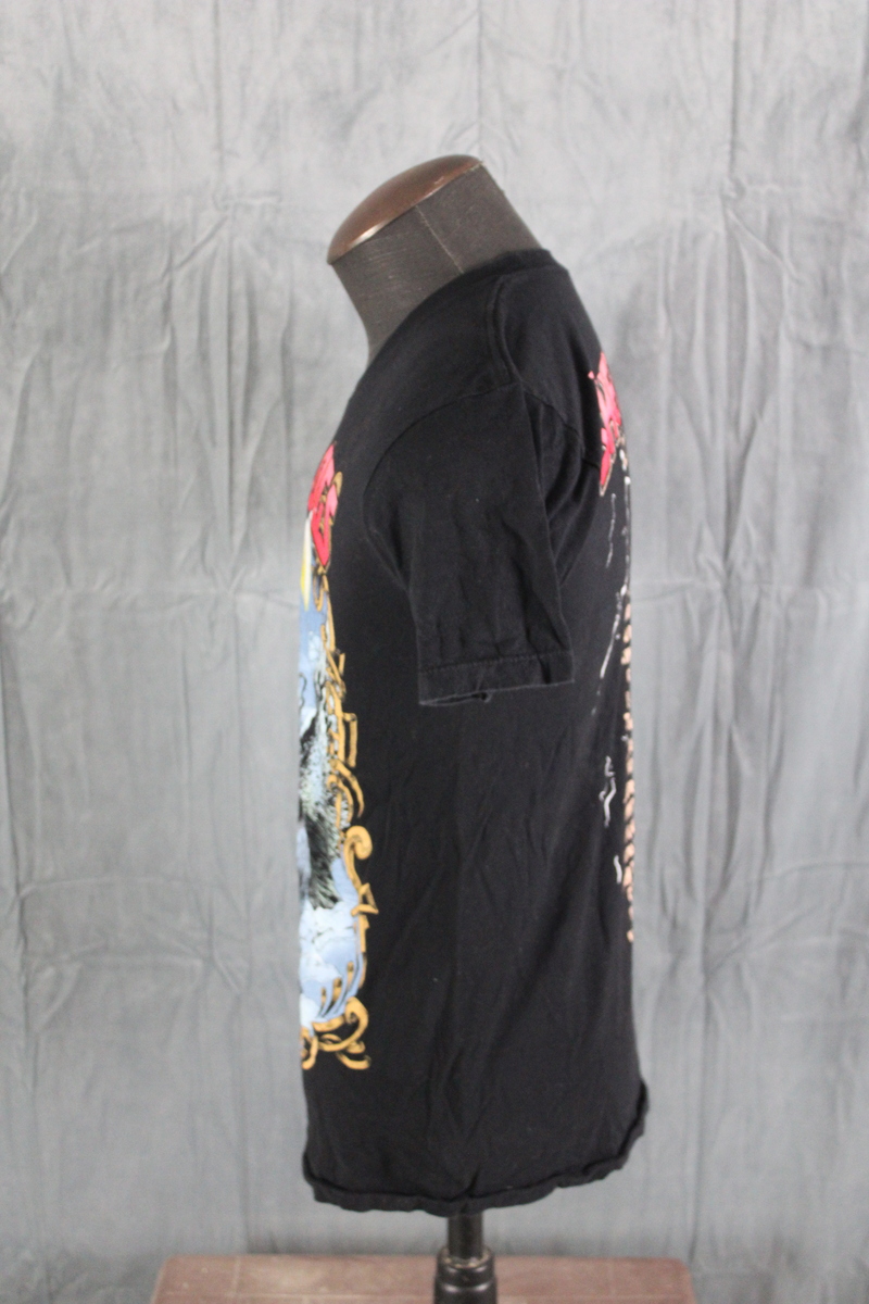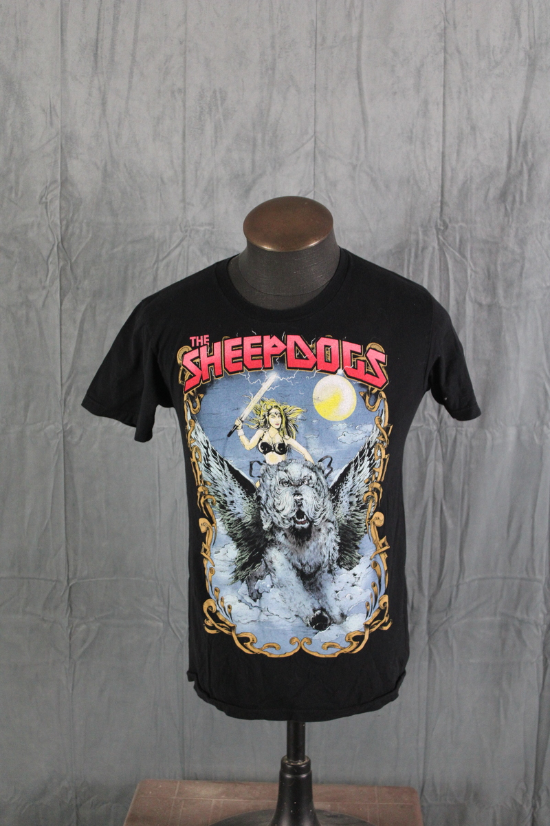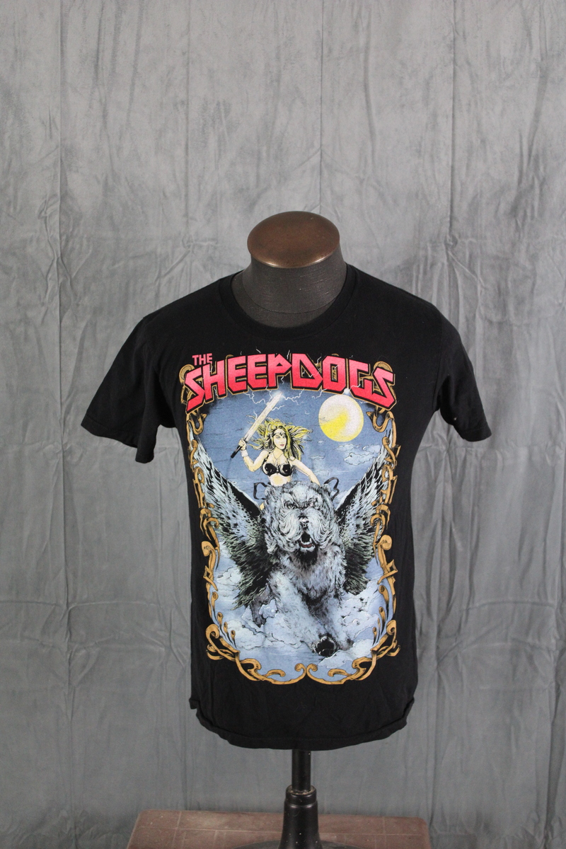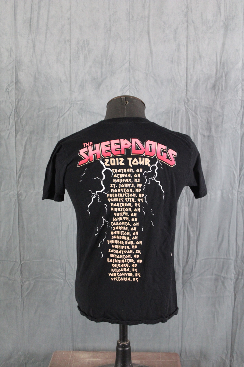 Up for sale is a retro band shirt. It has a black base colour with Sheepdogs and a large graphic of a lady riding a sheepdog on the front. The back of the shirt has the tour dates from their 2012 Canadian tour. What a great shirt do not miss out on it.