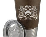 Bring your drink and your Irish pride with you wherever you go with this beautiful travel mug. We expertly laser your very own authentic Irish coat of arms and surname into a rustic brown leather to reveal a metallic gold design. With each mug's metal insulation, your beverage will stay cooler or hotter longer. Comes with a removable lid with drinking hatch. Over 1000 available Irish coat of arms names.