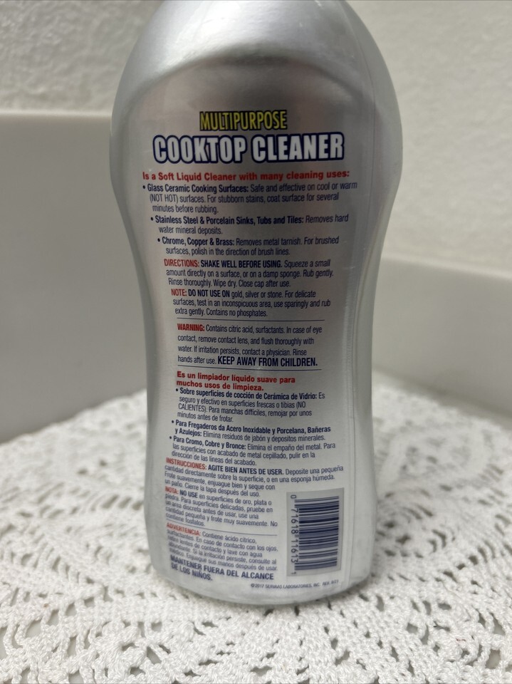 The Bar Keepers Friend 13 oz Multipurpose Cooktop Cleaner is a liquid cleaner specifically designed for glass ceramic cooking surfaces. It comes in a 13 oz bottle and has a soft consistency for easy application. The original scent leaves a fresh smell after cleaning. This all-purpose cleaner is ideal for stoves and is effective in removing tough stains and grime.